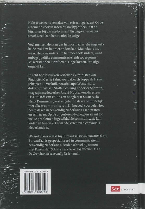 Veel mensen denken dat het normaal is, die ingewikkelde taal. Dat het niet anders kan. Maar dat is niet waar. Het kan anders. En het moet ook anders, want onbegrijpelijke communicatie leidt tot ergernis. Misverstanden. Conflicten. Hoge kosten. Ernstige ongelukken. In acht hoofdstukken vertellen ex-minister van Financiën Gerrit Zalm, voetbalcoach Foppe de Haan, schrijver J.J. Voskuil, notaris Lupo Westerhuis, dokter Christiaan Stoffer en chirurg Roderick Schmitz, magazijnmedewerker André Hopstaken, directeur van Philips Lisa Stuardi en hoogleraar staatsrecht Henk Kummeling wat er gebeurt als we onduidelijk met elkaar communiceren. En hoeveel voordelen het heeft als we in eenvoudig Nederlands gaan praten en schrijven. Op de bijgesloten dvd leggen zij uit tot welke problemen ingewikkelde communicatie kan leiden in hun vak. En wat de kracht van eenvoudig Nederlands is. Wessel Visser werkt bij BureauTaal (www.bureautaal.nl). BureauTaal is gespecialiseerd in communicatie in eenvoudig Nederlands. Eerder schreef hij samen met Karen Heij Schrijven in eenvoudig Nederlands en De Grondwet in eenvoudig Nederlands. |