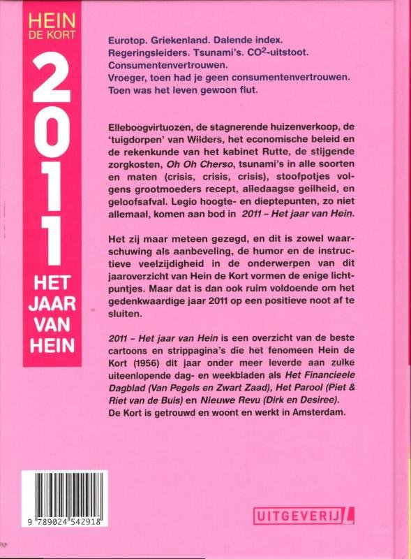 Jaar in jaar uit verschijnt het werk van Hein de Kort met verslavende regelmaat in zulke uiteenlopende dag- en week - bladen als Het Financieele Dagblad, Libelle (4onder1kap), Het Parool (Piet en Riet) en Nieuwe Revu (Dirk & Desiree).Naast een uitgesproken fantasie beschikt De Kort over een uitermate scherpe kijk op de actualiteit. Geïnspireerd door de alledaagse werkelijkheid en de vaderlandse televisie, geeft De Kort op humoristische wijze commentaar. Het beste van het beste werk – en dat is heel goed – dat Hein de Kort in het bewogen jaar 2011 tekende en schreef is nu voor de derde keer op rij samengevat in één jaarboek. Van de tsunami tot en met de financiële crisis, die allang niet meer alleen financieel is, en andere luxeproblemen. Alles komt op uiterst vermakelijke en relativerende wijze aan bod in 2011 – Het jaar van Hein, een must voor elke Hein-liefhebber en een perfect cadeau als enthousiasmerende kennismaking voor de nieuwkomer.In 1992 werd het oeuvre van Hein de Kort bekroond met de Stripschapprijs, de hoogste onderscheiding die de Nederlandse strip kent. De Kort is getrouwd en woont en werkt in Amsterdam.