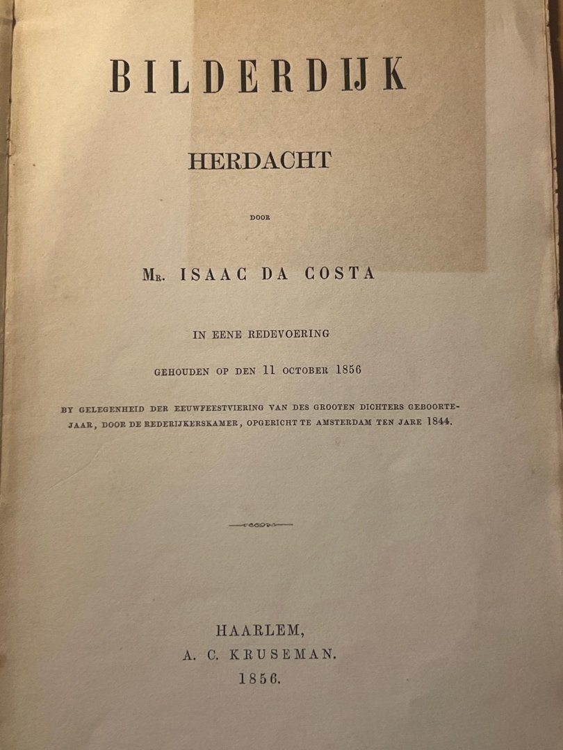 Costa, Isaäc da - Literature 1856 | Bilderdijk herdacht in een