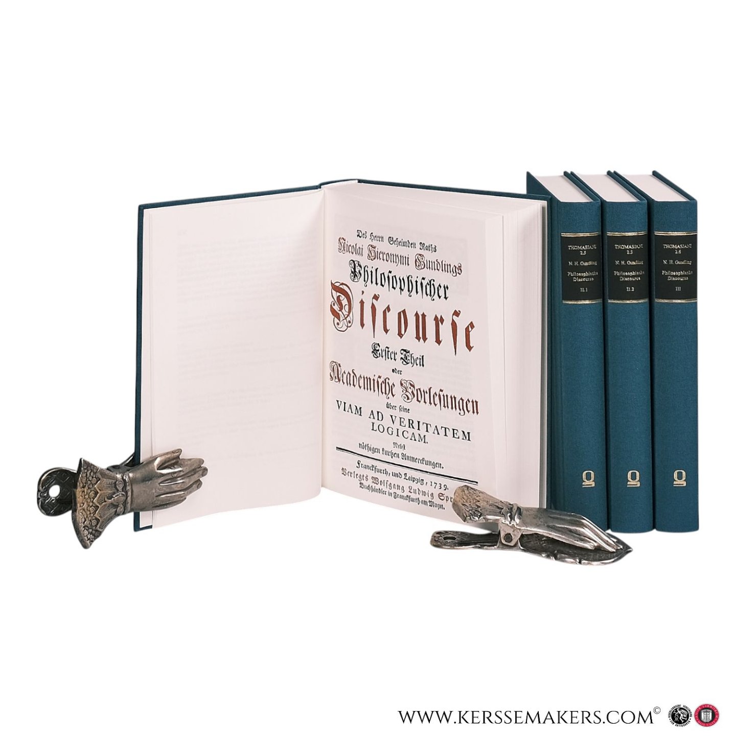 6, text in German. Reprint of the original editions published in Frankfurt am Main and Leipzig in 1739-1740. Complete set in four volumes. Volume 1 covers logic (Vernunft-Lehre oder Logique), volumes 2 and 3 address ethics (Sitten-Lehre) and natural law (Recht der Natur), both based on Gundling's 'Via ad Veritatem'. Very good/ fine condition, see picture.