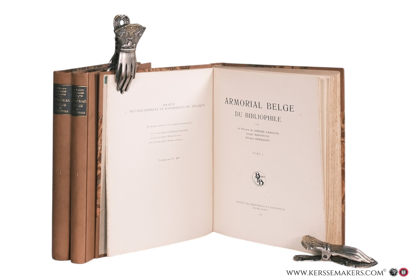 covers with marbled paper; morocco title-label on spines. Original wrappers, including spine, preserved. Uncut. xii,384,(ii:blank)pp.; (vi)p. & p.387-629 & (v:blank)pp.; (viii)p., & p.633-947 & (iii:blank)pp. With 38 plates and numerous illustrations in text showing coats of arms i.a. many armorial bindings. - Printed in 700 numbered copies. This is number 497 printed on 'papier Hendon ordinaire'. - Nice set