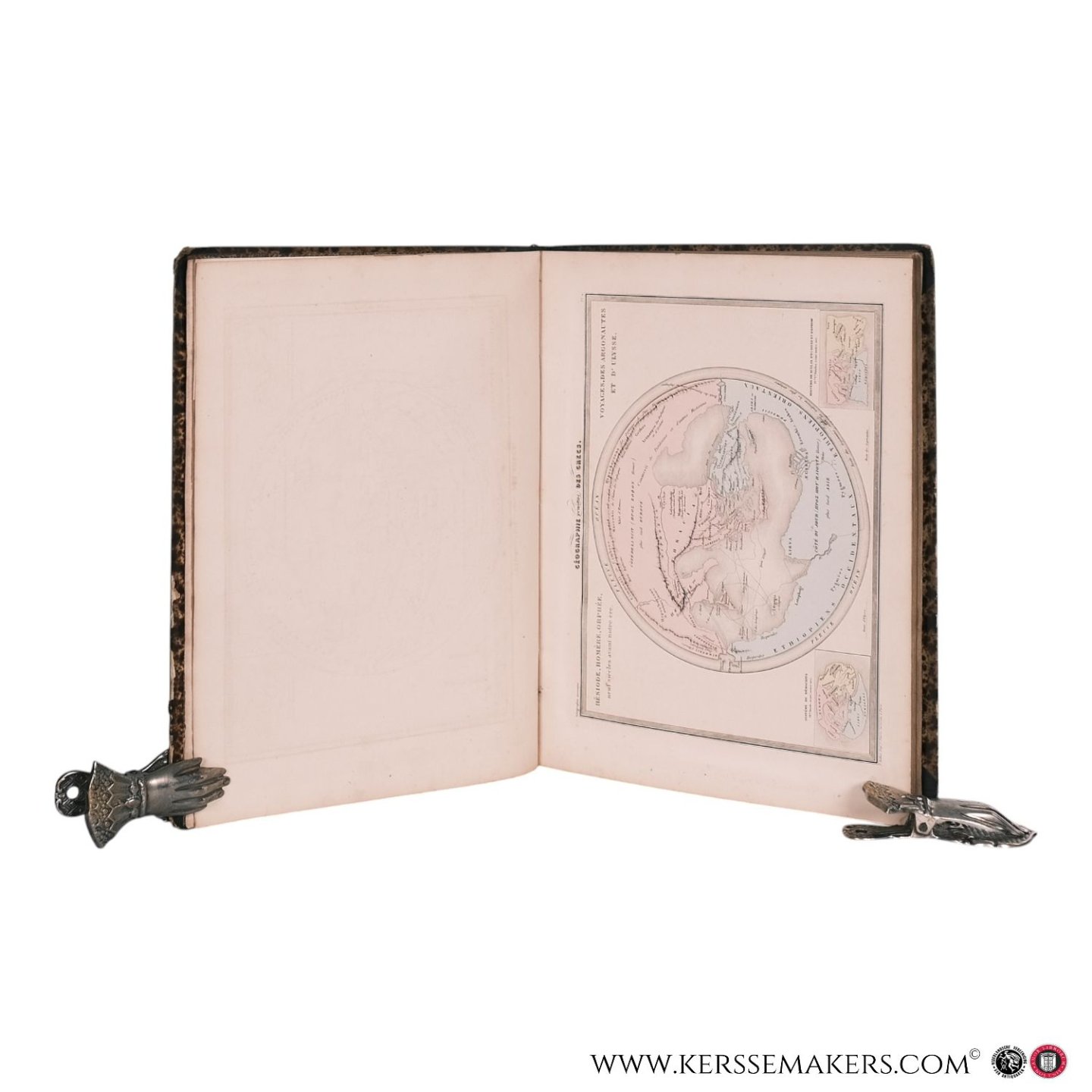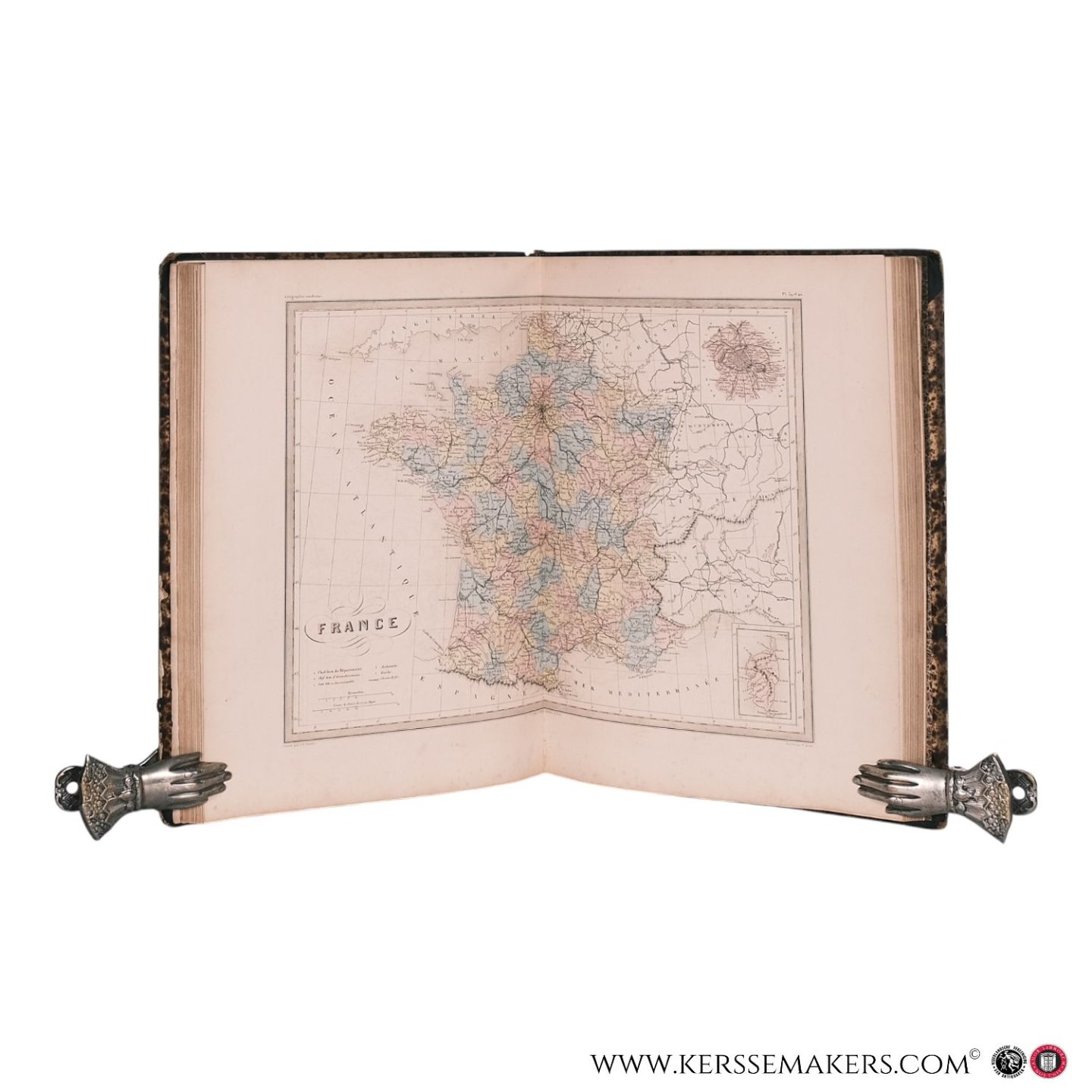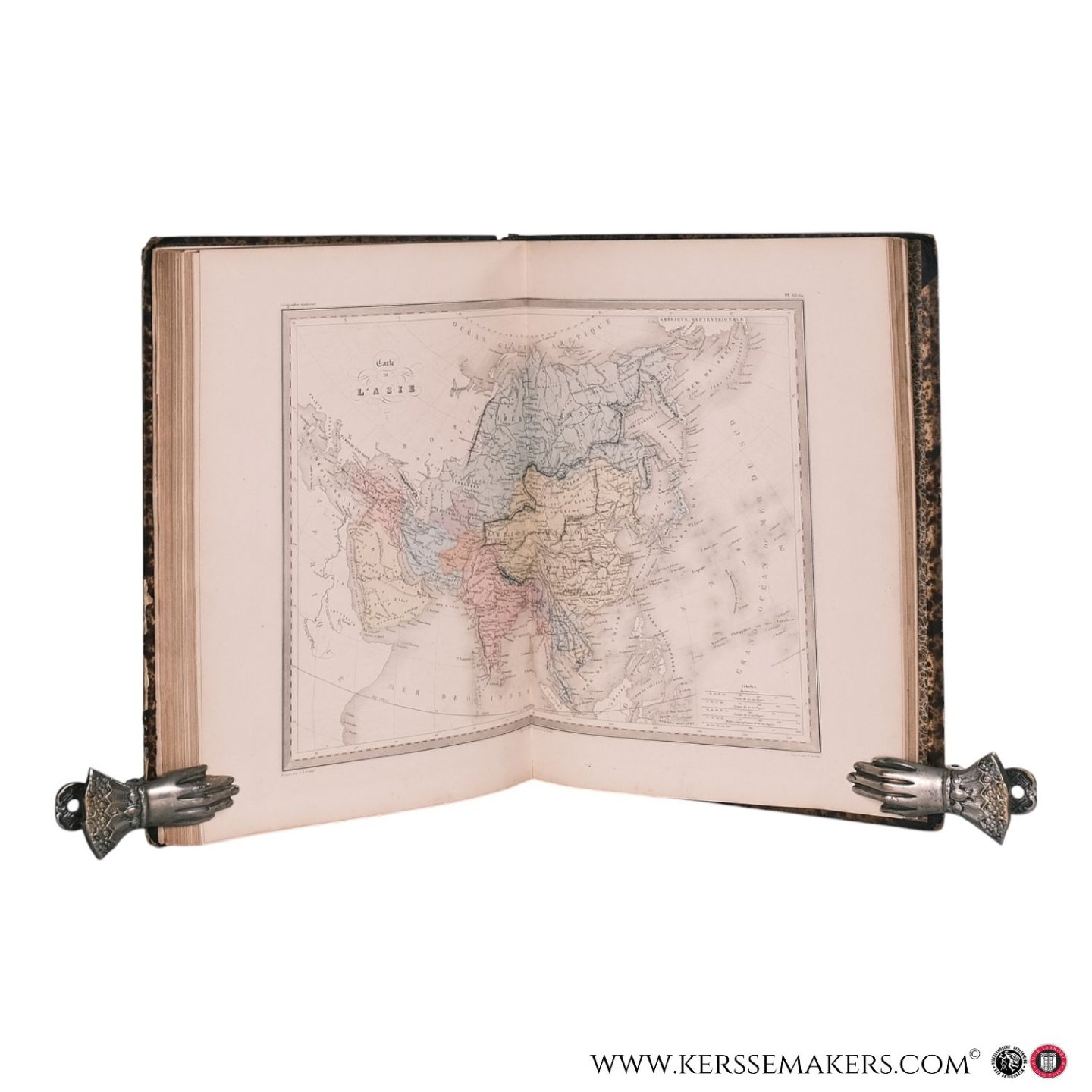 gilt title on spine; covers with decorated paper; marbled endpapers (corners damaged; rubbings to decorated paper; hinges rubbed and small tear in first hinge; top spine damaged). Verso marbled endpaper "Liste des Cartes", (ii) pp.: Title (inner corners of "Liste" and "Title" waterstained) and 72 maps, numbered 1-86: 14 double-page maps. - Lithographed maps by Sarrazin, all in color and in fine spotless condition. 'Géographie ancienne': 26 maps and 'Géographie moderne': 46 maps. - The 14 double-page maps: 1) Table Théodosienne. - 2-4) Carte géologique Europe, Carte physique France & Coups géologiques. - 5) Mappe monde Mercator. - 6) Les hémisphères. - 7) Europe. - 8) France. - 9)Allemagne. - 10) Russie d'Europe. - 11) Espagne et Portugal. - 12) Asie. - 13) Afrique. - 14) Océanie.
