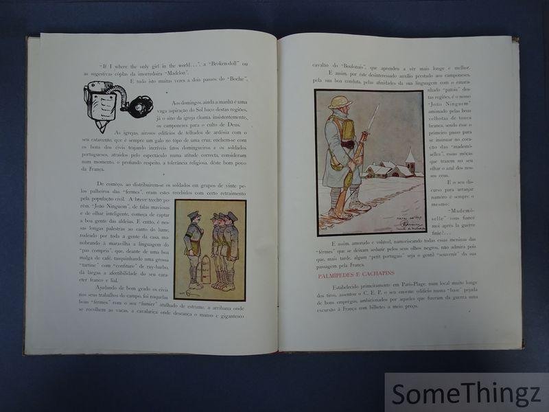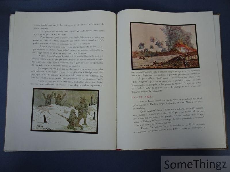 João Ninguém: soldier of the Great War: humorous impressions of the C.E.P. written by Captain Meneses Ferreira (author and illustrator), it refers to the efforts of the Portuguese Expeditionary Corps sent to France (in which the author was integrated), whose soldiers fought in the First World War. It was published by Livraria Portugal-Brasil, with a total of 64 pages. It belongs is considered a "bibliographic rarity". (see: wikipedia) / The tragicomedy of soldier John Nobody in World War I. And what if, in the midst of suffering, the human spirit, at its best, could laugh at misfortune, joke about fear, mock problems, enjoy its own flaws, weaknesses and sadness? This is the tragicomic war of John Nobody, told in words and drawings by those who lived it, in the distant years of 1917 and 1918, on land cut through by the Lys canals. Portugal's participation in World War I did not leave good memories for anyone. It was a drama, from a human, social and economic point of view, which also failed to achieve the political and geostrategic objectives that would justify the country's involvement in the conflict. The soldiers, who fought in Africa and Europe, were subjected to physical and moral exhaustion, hunger, cold and risks arising from insufficient preparation and inadequate equipment. But what if, in the midst of so much suffering, the human spirit, at its best, could laugh at misfortune, joke about fear, mock problems, and make fun of its own flaws, weaknesses, and sadness? This was exactly what Captain Menezes Ferreira did, a member of the Portuguese Expeditionary Corps in the distant territories of Aire Sur La Lys, a land that was soon renamed Lys-bonne, so many were the Portuguese settled there. João Ninguém Soldado da Grande Guerra is a tragicomedy written and drawn by a man, about himself and his peers, subjected to extreme situations and, even so, finding in it a spirit that is difficult to break. It tells the story of the friendly little soldiers, swarthy men who, from the eight provinces of Portugal, rushed with backpacks on their backs without missing boarding to honor their battalions. Among these was João Ninguém, like the others, a representative of the small fry of international society, who after having endured the sun of Paulona de Tancos, lightly covered in very rudimentary warrior training, was finally called to embark in that harsh winter of 1917, with the aim of going to fight the boches. He talks about the adventures of the four long days at sea and the train journey, drowning his sorrows in the brandy of the ration, already half resigned and wrapped up in the fatalism that came to them from their race. He animatedly describes the functions of the various soldiers the mischief between palmípedes and cachapins, between soldiers and officers; the camaraderie, the rehearsals and maneuvers where he showed himself to be half Zagalo, half fado singer and the relationship with the other contingents on the ground. All in an unusually fun way. And the tone continues even in the trenches, even with the miserable conditions of his life as a mole, inside the shelters, around empty cans improvised braziers, anxiously awaiting the time to kill or be killed. Only at the end does the tone slip into some bitterness, in the face of the rage of destruction, the constant and deleterious breath of death, which hardened the hearts of the combatants, as a result, perhaps, of the terrible months for the small Portuguese army, which were January, February and March of 1918, in the battalions decimated by gas attacks, exhausted by mortifying service, frozen with cold, barely warmed by rum and bent less by the weight of their equipment than by that of their incredible bundles of Maltese. Finally, he tells of that terrifying battle of the Lys, in which infantrymen and machine gunners, weapons in hand, in a perfect awareness of extreme sacrifice, allowed themselves to be killed until the last cartridge. John Nobody stayed there. Menezes Ferreira was lucky enough to return to print this extraordinary narrative of the first global armed conflict. It is worth seeing the complete work, which I cannot do justice to. In uniform the color of mist Soldiers of our land, Wooden crosses, each one Represents the War Cross To Portugal my mother gave her son to the soldier: Whoever gives what he has Is not obliged to give more? On the sidelines The Portuguese soldiers interacted easily with the French population and, in the short time they had before being sent to the front, they quickly lived up to their reputation as flirts. They helped the peasants and in return, they invited them to their homes. This gave them the freedom to try to win over the local girls, a mission in which they competed with the steaks, skinny and phlegmatic, especially having on their side the prestige of pounds, always a competitor in matters of the heart. The Portuguese motto was always the same, in scratchy French: Mademóselle vous fiancé moi aprés la guerre finie. And so, John Nobody, carried away by his good conduct and the affinities of his language with the tangled patois of those regions, managed to insinuate himself into the hearts of the mademóselles. Loving and fickle, flirting with all those girls from the fermes who let themselves be seduced by his black eyes, it is no wonder, therefore, that, later on, some petit portugais read a Portuguese-Portuguese baby was the kind souvenir of his time in France. But that's another story. (from: osaldahistoria.blogs.sapo.pt)