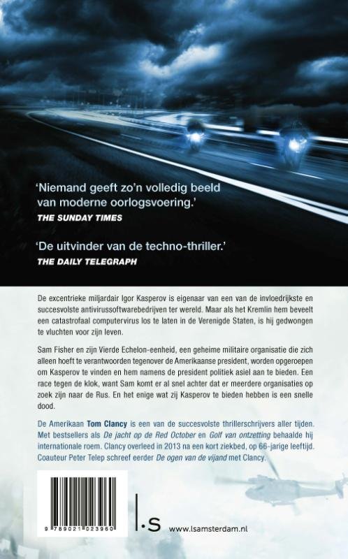 Zwarte lijst is een Sam Fisher thriller van de Amerikaanse topauteur Tom Clancy, bekend van De jacht op de Red October.De excentrieke miljardair Igor Kasperov is eigenaar van een van de invloedrijkste en succesvolste antivirussoftwarebedrijven ter wereld. Maar als het Kremlin hem beveelt een catastrofaal computervirus los te laten in de Verenigde Staten, is hij gedwongen te vluchten voor zijn leven.Sam Fisher en zijn Vierde Echelon-eenheid, een geheime militaire organisatie die zich alleen hoeft te verantwoorden tegenover de Amerikaanse president, wordt opgeroepen om Kasperov te vinden en hem namens de president politiek asiel aan te bieden. Een race tegen de klok, want Sam komt er al snel achter dat er meerdere organisaties op zoek zijn naar de Rus. En het enige wat zíj Kasperov te bieden hebben is een snelle dood.‘Niemand geeft zo’n volledig beeld van moderne oorlogsvoering.’ The Sunday Times‘De uitvinder van de techno-thriller.’ The Daily Telegraph