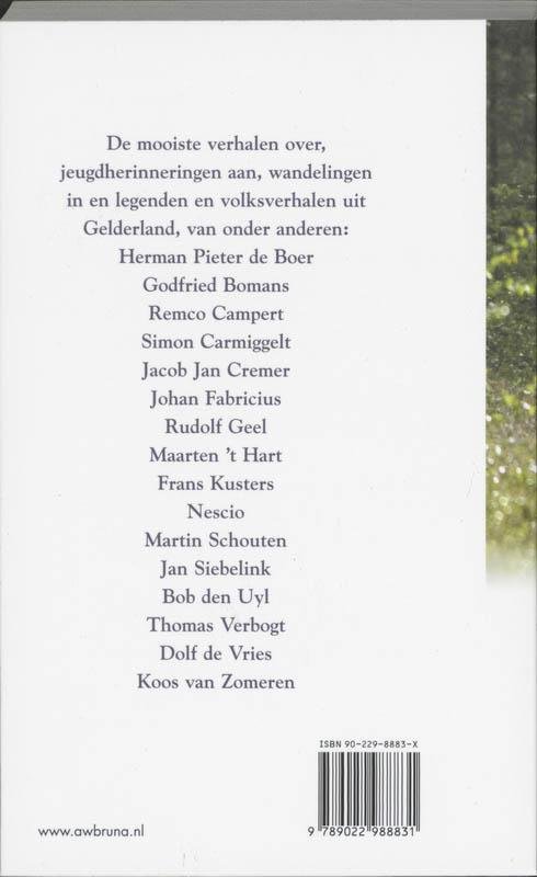 De mooiste verhalen over, jeugdherinneringen aan, wandelingen in en legenden en volksverhalen uit Gelderland, van onder anderen: Herman Pieter de Boer Godfried Bomans Remco Campert Simon Carmiggelt Jacob Jan Cremer Johan Fabricius Rudolf Geel Maarten 't Hart Frans Kusters Nescio Martin Schouten Jan Siebelink Bob den Uyl Thomas Verbogt Dolf de Vries Koos van Zomeren
