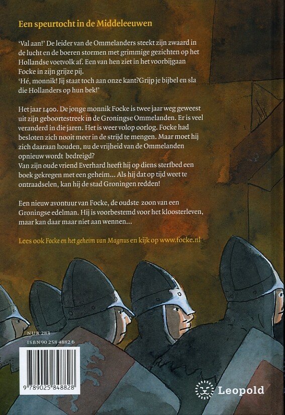 De jonge monnik Focke is twee jaar weg geweest uit zijn geboortestreek in de Groningse Ommelanden. Er is veelveranderd in die jaren. Het is weer volop oorlog. Focke had besloten zich nooit meer in de strijd te mengen. Maar moet hij zich daaraan houden, nu de vrijheid van de Ommelanden opnieuw bedreigd wordt?Van zijn leraar heeft hij op diens sterfbed een boek gekregen met een geheim… Als hij dat op tijd weet te ontraadselen, kan hij de stad Groningen redden!Een nieuw avontuur van Focke, de zoon van een Groningse edelman. Hij is voorbestemd voor het kloosterleven, maarkan daar maar niet aan wennen…vanaf 10 jaar