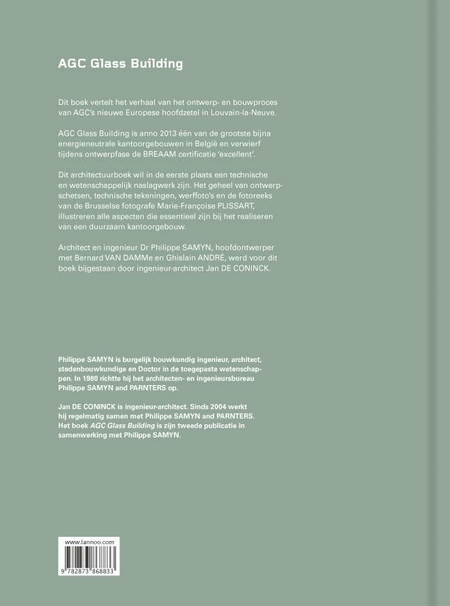 Dit boek vertelt het verhaal van het ontwerp- en bouwproces van AGC's nieuwe Europese hoofdzetel in Louvain-la-Neuve. AGC Glass Building is anno 2013 één van de grootste bijna-energieneutrale kantoorgebouwen in België en verwierf tijdens de ontwerpfase de BREAAM-certificatie 'excellent'. Dit architectuurboek wil in de eerste plaats een technische en wetenschappelijk naslagwerk zijn. Het geheel van ontwerpschetsen, technische tekeningen, werffoto's en de fotoreeks van de Brusselse fotografe Marie-Françoise Plissart, illustreren alle aspecten die essentieel zijn bij het realiseren van een duurzaam kantoorgebouw. Architect en ingenieur Dr Philippe Samyn, hoofdontwerper met Bernard Van Damme en Ghislain André, werd voor dit boek bijgestaan door ingenieur-architect Jan De Coninck.
