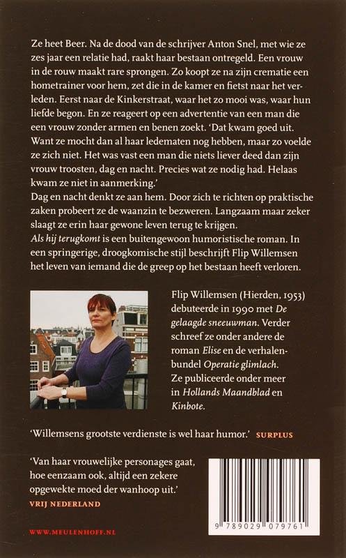 Als hij terugkomt is een buitengewoon humoristische roman. In een springerige, droogkomische stijl, die doet denken aan het werk van Maarten Biesheuvel, beschrijft Flip Willemsen het leven door de ogen van iemand die de greep op het bestaan heeft verloren. |