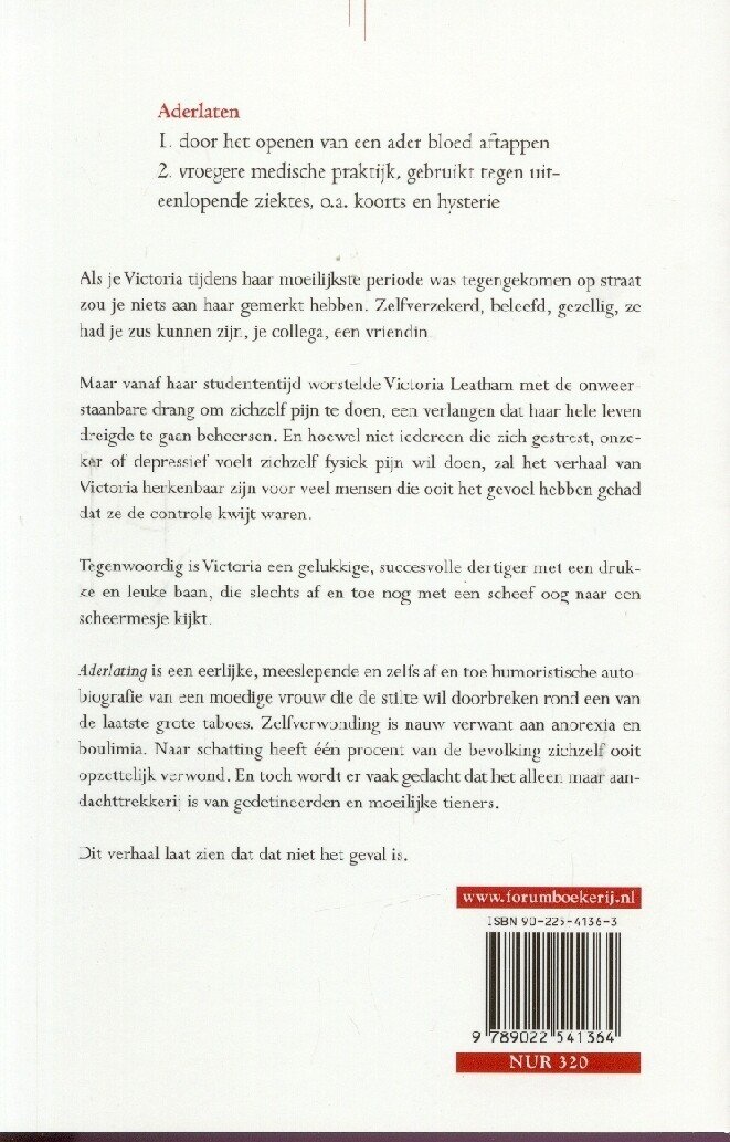 Ook tijdens haar moeilijkste periodes merkte een buitenstaander niets bijzonders aan Victoria Leatham. Ze was zelfverzekerd, beleefd, gezellig. Een gewone vrouw. Maar vanaf haar studententijd worstelde Victoria Leatham met de onweerstaanbare drang om zichzelf pijn te doen, een verlangen dat haar hele leven in beslag dreigde te nemen. En hoewel niet iedereen die gestrest, onzeker of depressief is zichzelf fysiek pijn wil doen, zal het verhaal van Victoria herkenbaar zijn voor veel mensen die ooit het gevoel hebben gehad dat ze de controle kwijt waren.Victoria Leatham voert ons mee naar de wereld van zelfverminking, een wereld die bevolkt kan worden door de meest uiteenlopende mensen, van prinsessen tot arme studenten. Jezelf tot bloedens toe snijden is angstig en angstaanjagend, een daad die meestal voortkomt uit schuldgevoel, maar die vaak wordt geassocieerd met het wegnemen van spanning en het oproepen van een bepaalde kick, en daardoor potentieel verslavend is. Automutilatie is een manier om om te gaan met overweldigende gevoelens. Voor buitenstaanders lijkt dit een buitengewoon wrede manier om jezelf te ‘helpen’. Uiteindelijk maakt dit je helemaal kapot. Toch ‘helpt’ het: de geestelijke pijn wordt draaglijker.Uit een Amerikaans onderzoek uit 1998, dat waarschijnlijk gelijkaardige cijfers voor België oplevert, blijkt dat 73% zich snijdt, 32% zichzelf verbrand en 30% zich slaat. 22% haalt oude wonden terug open, 10% trekt het haar uit en 8% breekt zijn botten. 78% gebruikt een combinatie van verschillende methodes, inclusief bovengenoemde.