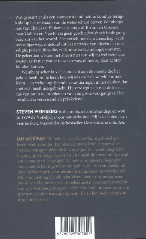 Wat gebeurt er als een vooraanstaand natuurkundige terugkijkt op het ontstaan van de wetenschap? Steven Weinbergs reis van Thales en Ptolemaeus langs al-Biruni en Oresme naar Galileo en Newton is geen geschiedenisboek in de gangbare zin van het woord. Het vertelt hoe de wetenschap, vaak toevalligerwijs, ontstond uit het netwerk van ideeën dat ook religie, poëzie, filosofie, wiskunde en technologie omvatte. De geleerden wisten niet alleen niet wat wij nu wél weten, ze wisten zelfs niet wat er te weten was, of hoe zij daar achter konden komen.Weinberg schenkt veel aandacht aan de moeite die het gekost heeft om te leren hoe wij iets over de wereld kunnen leren – en welke ingrijpende veranderingen in het denken dat met zich heeft meegebracht. Hij verdiept zich met de kennis van nu in de problemen van zijn grote voorgangers. Het resultaat is verrassend en prikkelend.Ian McEwan: ‘Ik heb De wereld verklaard geboeid gelezen. Het verandert het onedele metaal van een gewone wetenschapsgeschiedenis in zuiver goud – in een magistrale lofzang op de lange, heroïsche en nog altijd onvoltooide strijd om de natuur te begrijpen. Ik heb voor het eerst begrepen hoe moeilijk het is geweest om goden, mensen en doelen uit onze verklaringen voor natuurverschijnselen te verwijderen. Dit is een betoog dat elk relativisme met groot succes overboord zet. Het boek is een intellectueel inspirerend overzicht van wat Weinberg ons grote verhaal noemt, ons avontuur van georganiseerde nieuwsgierigheid. Ik heb het boek vol opwinding uitgelezen.’