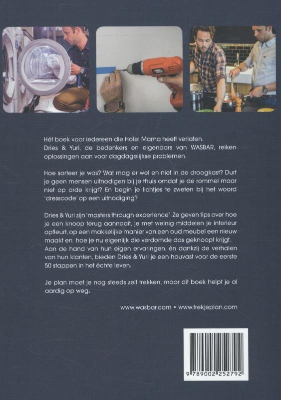 Hét boek voor iedereen die hotel mama heeft verlaten. Dries Henau & Yuri Vandenbogaerde, de bedenkers en eigenaars van WASBAR, reiken oplossingen aan voor dagdagelijkse problemen.Hoe sorteer je was? Wat mag er wel en niet in de droogkast? Durf je geen mensen uitnodigen bij je thuis omdat je de rommel maar niet op orde krijgt? En begin je lichtjes te zweten bij het woord 'dresscode' op een uitnodiging?Dries & Yuri zijn 'masters through experience'. Ze geven tips over hoe je een knoop terug aannaait, je met weinig middelen je interieur opfleurt, op een makkelijke manier van een oud meubel een nieuw maakt en hoe je nu eigenlijk die verdomde das geknoopt krijgt. Aan de hand van hun eigen ervaringen, én dankzij de verhalen van hun klanten, bieden Dries & Yuri je een houvast voor de eerste 50 stappen in het échte leven.Je plan moet je nog steeds zelf trekken, maar dit boek helpt je aardig op weg.Dries Henau & Yuri Vandenbogaerde studeerden in Gent, ontmoetten elkaar in die stad en bleven er plakken na hun studies. Ze combineerden een job in media en marketing met hun eigen creatief agentschap en woonden op 40m2. Zelf ontdekten ze de nood aan orde en netheid als je klein woont. Zelf leerden ze koken en zochten ze een oplossing om zelf hun was te doen, op een leuke manier. Zo bedachten ze WASBAR, dé oplossing voor mensen zonder wasmachine. In dit boek gaan ze verder met hun oplossingen voor alledaagse problemen als je alleen woont.In 2012 namen Dries & Yuri deel aan de wedstrijd Topstarter op Eén, waarop hun ondernemerstalent werd beloond met de eerste prijs en de titel Topstarter van het jaar.Over WASBAR:WASBAR maakt korte metten met de oersaaie routine van het wachten op je was in een tl-verlichte wasserette en maakt er beleving van. In WASBAR spreek je gezellig af met je vrienden, bij een lekkere koffie of aperitief. WASBAR Gent opende in oktober 2012, de vestiging in Antwerpen opende eind augustus 2013. Momenteel bekijken Dries & Yuri de plannen