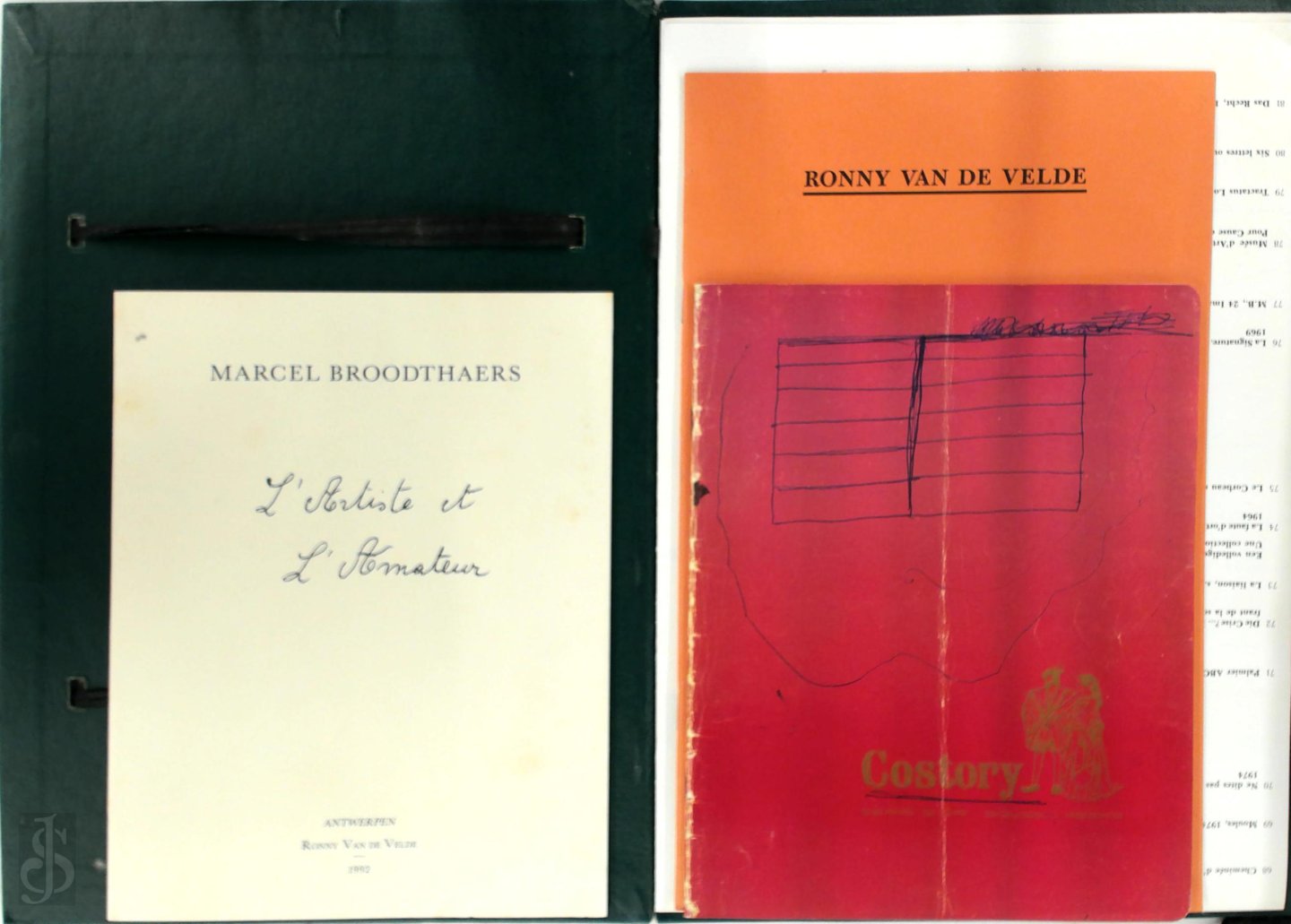 Catalogue of a double-exhibition: darkgreen hardback portfolio (hardcover), kept together by two black ribbons, containing a poster with colour illustrations of a selection of Broodthaers' work at view, as well as a list of all items; a facsimile print of his 1965 notebook \"L 'Artiste et l 'Amateur\" and a notebook with the French transcription; the James Ensor catalogue.