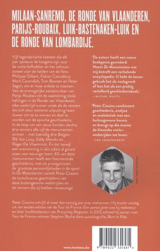 Milaan-San Remo, de Ronde van Vlaanderen, Parijs-Roubaix, Luik-Bastenaken-Luik en de Ronde van Lombardije. Vijf legendarische koersen die elk jaar opnieuw de hoogmis zijn voor de wielerliefhebber en het schouwtoneel voor de helden van de fiets: Philippe Gilbert, Fabian Cancellara, Mark Cavendish, Tom Boonen en Peter Sagan, om er maar een enkele te noemen. Van de onmogelijke kasseistroken van Parijs-Roubaix tot de waanzinnig steile hellingen in de Ronde van Vlaanderen, elke wedstrijd is even uniek als de renners die zich door extreme uitputting heen duwen om ze te winnen en deel te worden van de epische geschiedenis. In de loop van een eeuw konden slechts drie renners alle vijf de monumenten winnen – niet toevallig drie Belgen: Rik Van Looy, Eddy Merckx en Roger De Vlaeminck. En dat terwijl een overwinning in één editie staat garant voor eeuwige roem. Elk van deze monumenten heeft een fascinerende geschiedenis, met als protagonisten de grootste persoonlijkheden in de sport. In De Monumenten vertelt Peter Cossins de tumultueuze geschiedenis van deze buitengewone races en de renners die zij hebben vereeuwigd. Peter Cossins schrijft al meer dan twintig jaar over wielrennen. Hij bracht verslag uit van zestien edities van deTour de France. een aantal jaren was hij redacteur en later hoofdredacteur van Procycling Magazine. In 2012 schreef hij samen met Tour De France-winnaar Stephen Roche diens autobiografie, Born to Ride.