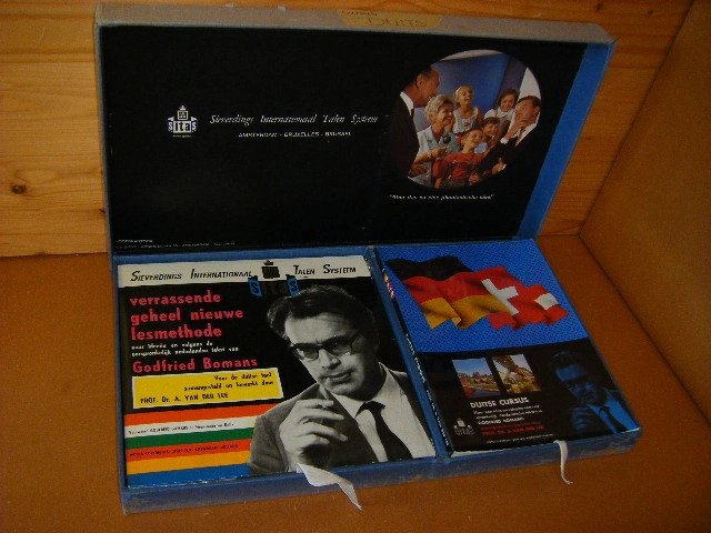 | Bijzonderheden: | Unieke set van 6 grammofoonplaten, 3 lesboeken en een nog ongebruikt correctieschrift in een linnen bewaardoos. Nog in vrij goede staat. 1 boek iets gerepareerd met een plakbandje, doos wat gevlekt, maar nog vrij stevig. |
