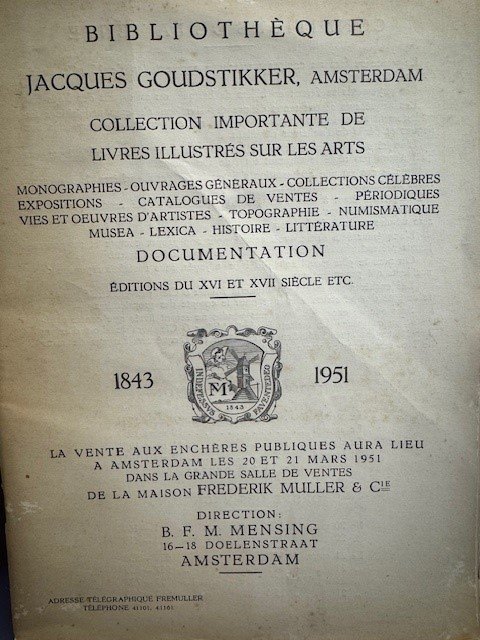Bibliotheque Jacques Goudstikker, Amsterdam. Collection importante de livres illustres sur les arts (...) vente (...) 20 et 21 Mars 1951 de la Maison Frederik Muller & Co. Amsterdam, Fredereik Muller, 1951, 36pp. with 698 titles, original softcover paper binding, no illustrations, auction catalogue of the bookcollection of the famous art dealer Jacques Goudstikker. Jacques Goudstikker (30 August 1897 - 16 May 1940) was a Jewish Dutch art dealer who fled the Netherlands when it was invaded by Nazi Germany during World War II, leaving three furnished properties and an extensive and significant art collection including over 1200 paintings, many of which had been previously catalogued as "Old Masters". The entire collection, which had been surveyed by Hermann Goering himself, was subsequently looted by the Nazis. Between the two World Wars, Jacques Goudstikker had been the most important Dutch dealer of Old Master paintings, according to Peter C. Sutton, executive director and CEO of the Bruce Museum of Arts and Science. Despite efforts of Goudstikker's widow after the war to regain possession of the collection, it was not until after her death that the Dutch government finally restituted 202 paintings to the Goudstikker family in 2006. To finance efforts to reclaim more of the stolen art, a large portion of them were sold at auction in 2007 for almost $10 million. Goudstikker was born in Amsterdam as the son of the art dealer Eduard Goudstikker. He studied at the commercial school in Amsterdam, and more intensely (?) with Wilhelm Martin and William Vogelsang at Leiden and Utrecht. In 1919, he joined his father's Amsterdam gallery, restructured it as a public besloten vennootschap with himself as the director and major shareholder, and introduced a notably more international style; publishing catalogues in French rather than Dutch, and showing for the first time Italian Renaissance paintings, including The Madonna and Child by Francesco Squarcione. This was revolutionary in the Netherlands of the time, where in 1906, Adriaan Pit, the director of the Rijksmuseum, had stated "We have become chauvinistic with regard to the field of art. This worship of our old school of painting, which started thirty years ago is still alive and appears not to let us appreciate any foreign art While escaping the Nazis in May 1940, Goudstikker fell in the hold of the SS Bodegraven in the English Channel, fatally breaking his neck (source Wikipedia). Scarce.