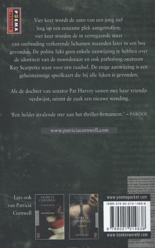 Al wat overblijftVier keer worden er lichamen van jonge stellen gevonden in een vergaande staat van ontbinding. Patholoog-anatoom Kay Scarpetta en de politie lijken geen enkele aanwijzing te kunnen vinden over de identiteit van de moordenaar. En dan verdwijnt de dochter van een senator samen met haar vriendje...Patricia Cornwell is een vooraanstaand misdaadverslaggeefster geweest. Ze woont in Richmond, Virginia. Haar thrillerserie over de vrouwelijke patholoog-anatoom Kay Scarpetta is onder meer bekroond met de Edgar Award en de Gold Dagger Award.Over Al wat overblijft:'Geen effectbejag en breed uitgemeten onsmakelijkheden bij Cornwell, wier spannende en leerzame romans een volmaakte evenwicht van gevoel en verstand vormen.' Opzij