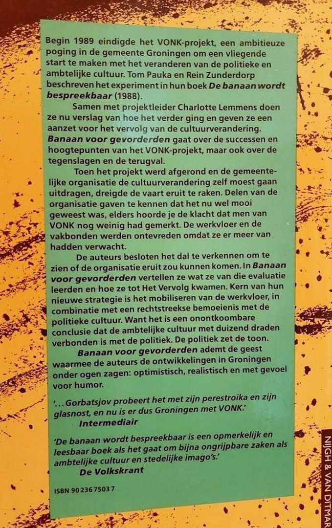 Begin 1989 eindigde het VONK-projekt, een ambitieuze poging in de gemeente Groningen om een vliegende start te maken met het veranderen van de politieke en ambtelijke cultuur. Tom Pauka en Rein Zunderdorp beschreven het experiment in hun boek De banaan wordt bespreekbaar (1988). Samen met projektleider Charlotte Lemmens doen ze nu verslag van hoe het verder ging en geven ze een aanzet voor het vervolg van de cultuurverandering. Banaan voor gevorderden gaat over de successen en hoogtepunten van het VONK-projekt, maar ook over de tegenslagen en de terugval. Toen het projekt werd afgerond en de gemeentelijke organisatie de cultuurverandering zelf moest gaan uitdragen, dreigde de vaart eruit te raken. Delen van de organisatie gaven te kennen dat het nu wel mooi geweest was, elders hoorde je de klacht dat men van VONK nog weinig had gemerkt. De werkvloer en de vakbonden werden ontevreden omdat ze er meer van hadden verwacht. De auteurs besloten het dal te verkennen om te zien of de organisatie eruit zou kunnen komen. In Banaan voor gevorderden vertellen ze wat ze van die evaluatie leerden en hoe ze tot Het Vervolg kwamen. Kern van hun nieuwe strategie is het mobiliseren van de werkvloer, in combinatie met een rechtstreekse bemoeienis met de politieke cultuur. Want het is een onontkoombare conclusie dat de ambtelijke cultuur met duizend draden verbonden is met de politiek. De politiek zet de toon. Banaan voor gevorderden ademt de geest waarmee de auteurs de ontwikkelingen in Groningen onder ogen zagen: optimistisch, realistisch en met gevoel voor humor.