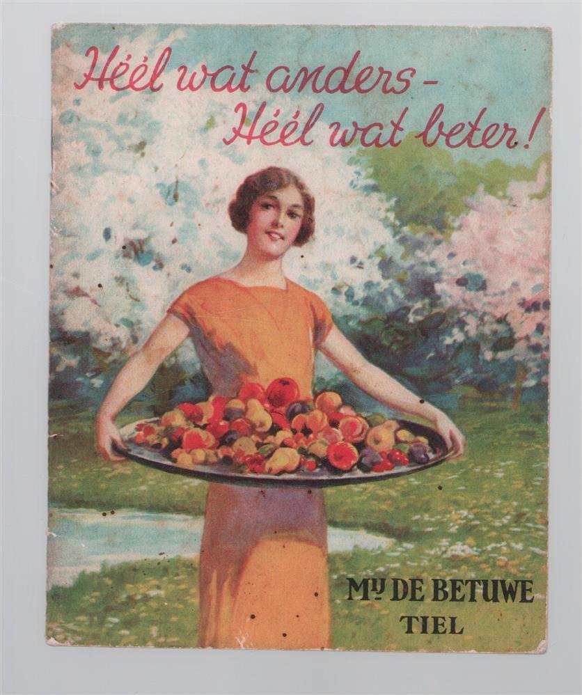 | Bijzonderheden: | n.d., Zeer goed, 32 Pagina's recepten en reclame voor De Betuwe producten.., c 15 x 12cm.., Omslag van een vrouw met schaal fruit in een boomgaard met bloemen ( ??) |