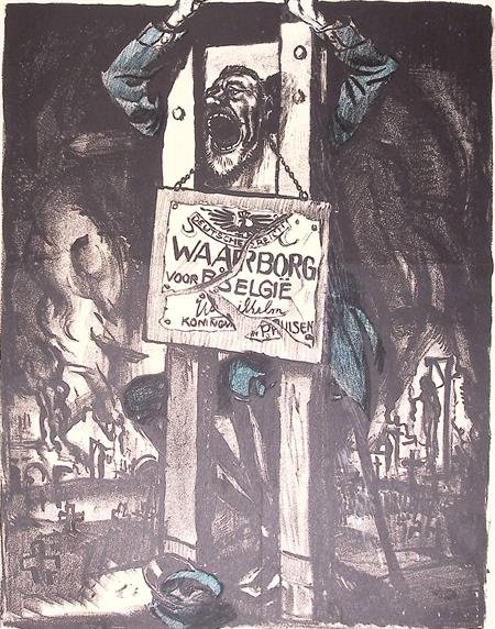 Duitse rijkskanselier als hypocriet over neutraliteit op spotprentMooie kleurenlitho, gemaakt door Jan Sluijters als bijvoegsel voor de Nieuwe Amsterdammer. Deze Nederlandse krant bracht wekelijks een krant uit tijdens de eerste wereldoorlog, altijd voorzien van een spotprent.Het betreft hier nummer 93, uitgegeven op 07-10-1916.Duitse rijkskanselier Theobald von Bethmann zit aan een schandpaal. Om zijn nek hangt een verscheurd 'Waarborg voor Belgie'. Op de achtergrond staan brandende steden, galgen en graven.De ondertitel leest: DEUGDZAME EXTASE TEGEN ROEMENIË Bethmann beklaagt zich in verband met Roemenië over ,,politieke toestanden, waaronder woorden van ministers en Koningen niets meer waard zijn'.De afmeting van deze prent is 32 bij 48 centimeter.Deze prent is meer dan honderd jaar oud en in tijden van oorlog gedrukt. Het papier kan op plekken beschadigd zijn, zie de foto's voor de details om te zien wat de exacte staat van de prent is.#spotprent #propaganda #krant #ww1 #eerstewereldoorlog #litho #oorlog #kunst #cadeau #stoer #Duitsland #Neutraliteit #Roemenie #Belgie