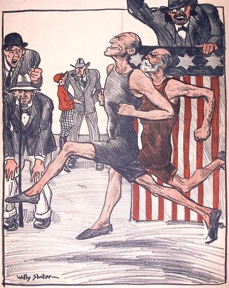 | Titel: | Spotprent over Amerikaanse verkiezing tijdens Eerste Wereldoorlog |