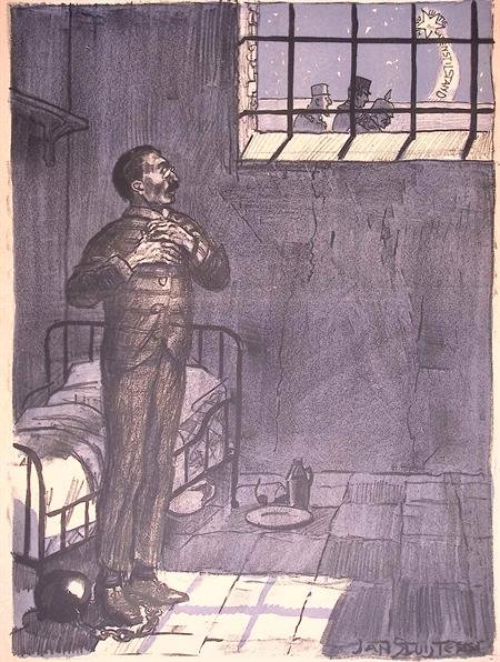 Hoop op vrede in Europa tijdens Eerste Wereldoorlog op spotprentJan Sluijters maakte deze spotprent als bijvoegsel voor de Nieuwe Amsterdammer. Deze krant bracht wekelijks een krant uit tijdens de eerste wereldoorlog, altijd voorzien van een originele spotprent.De spotprent is uitgegeven op 22-12-1917 met als volgnummer 156.Karl Liebknecht staat in een cel. Uit het raam is een kerstster te zien met de tekst 'Revolutie Wapenstilstand'. Er lopen drie figuren langs; Wilhelm II van Duitsland, Karl van Oostenrijk-Hongarije en Ferdinant I van BulgarijeOp de prent is een ondertitel te lezen: DE VERKEERDE DRIEKONINGEN Liebknecht: - Onze ster uit het Oosten... Kon ik mijn boeien breken!.Jan Sluijters heeft zijn handtekening in de litho rechts onder verwerkt.De prent heeft een afmeting van 32 bij 48 centimeter.Deze prent is meer dan honderd jaar oud en in tijden van oorlog gedrukt. Het papier kan op plekken beschadigd zijn, zie de foto's voor de details om te zien wat de exacte staat van de prent is.#spotprent #propaganda #krant #ww1 #eerstewereldoorlog #litho #oorlog #kunst #cadeau #stoer #Vrede #Europa #Duitsland #Oostenrijk