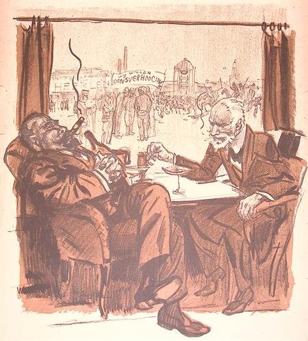 Politiek en schaarste in Nederland tijdens Eerste Wereldoorlog op spotprentJan Sluijters maakte deze spotprent als bijvoegsel voor de Nieuwe Amsterdammer. Deze krant bracht wekelijks een krant uit tijdens de eerste wereldoorlog, altijd voorzien van een originele spotprent.Het betreft hier nummer 131, uitgegeven op 30-06-1917.Posthuma en Cort ziten aan een tafel met champagne te roken. Buiten wordt er gedemonstreerd voor loonsverhoging.Op de prent is een ondertitel te lezen: DE REGEERING EN DE KOLENVOORZIENING Posthuma: - Staking? Wat kan ons dat schelen! Als we kolengebrek kijkgen, zenden we maar weer wat meer levensmiddelen over de grens!.De handtekening van Jan Sluijters is links onder in de litho verwerkt.De afmeting van deze prent is 32 bij 48 centimeter.Deze prent is meer dan honderd jaar oud en in tijden van oorlog gedrukt. Het papier kan op plekken beschadigd zijn, zie de foto's voor de details om te zien wat de exacte staat van de prent is.#spotprent #propaganda #krant #ww1 #eerstewereldoorlog #litho #oorlog #kunst #cadeau #stoer #Posthuma #Cort #Regering #Staking