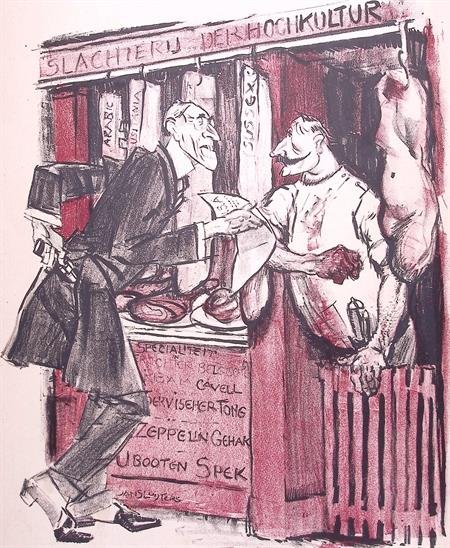 Wilhelm als slager in gesprek met Wilson op spotprentJan Sluijters maakte deze spotprent als bijvoegsel voor de Nieuwe Amsterdammer. Deze krant bracht wekelijks een krant uit tijdens de eerste wereldoorlog, altijd voorzien van een originele spotprent.Het betreft hier nummer 70, uitgegeven op 29-04-1916.Wilhelm II staat in een slagerij 'Der Hochkultur' in gesprek met Wilson. Er hangen lappen vlees aan haken met de teksten 'Arabic', 'Lusitania', 'Sussex'. Naast Wilhelm hangt een menselijk torso. Onder de toonbank staan teksten die duiden op Duitse oorlogsdaden. Wilson heeft half een revolver uit zijn achterzak.Op de prent is een ondertitel te lezen: WILHELM: - ALWEER EEN NOTA?WILSON: - NEE, NNOU EEN KWITANTIE, EN STRAKS, ALS JE NIET OPPAST, DE STERKE ARM!.Jan Sluijters heeft zijn handtekening in de litho links onder verwerkt.De afmeting van deze prent is 32 bij 48 centimeter.Deze prent is meer dan honderd jaar oud en in tijden van oorlog gedrukt. Het papier kan op plekken beschadigd zijn, zie de foto's voor de details om te zien wat de exacte staat van de prent is.#spotprent #propaganda #krant #ww1 #eerstewereldoorlog #litho #oorlog #kunst #cadeau #stoer #Wilson #Wilhelm #Slager #Wilson