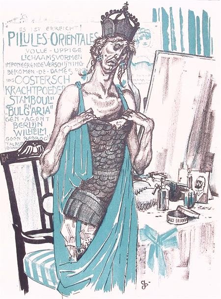 Spotprent over gefaalde Duitse militaire operaties tijdens Eerste WereldoorlogMooie kleurenlitho, gemaakt door Jan Sluijters als bijvoegsel voor de Nieuwe Amsterdammer. Deze Nederlandse krant bracht wekelijks een krant uit tijdens de eerste wereldoorlog, altijd voorzien van een spotprent.Het betreft hier nummer 51, uitgegeven op 18-12-1915.Een twee kleurenlitho door Jan Sluijters uit 1915. Getoont is een persoon wat Duitsland representeert. Deze kijkt teleurgesteld naar hun boezem. In de achtergrond staat reclame voor poeder wat een indrukwekkende boezem zou moeten bezorgen. Hiermee wordt een gelijkenis getrokken tussen Franse reclame uit 1911 en (gefaalde) Duitse machtsuitbreiding in het Midden-Oosten.Op de prent is een ondertitel te lezen: GERMANIA: DAAR HAD IK NOU ALLE HOOP OP, EN HET HEEFT ME NIETS GEHOLPEN!.Jan Sluijters heeft zijn handtekening in de litho midden onder initialen verwerkt.De prent heeft een afmeting van 32 bij 48 centimeter.Deze prent is meer dan honderd jaar oud en in tijden van oorlog gedrukt. Het papier kan op plekken beschadigd zijn, zie de foto's voor de details om te zien wat de exacte staat van de prent is.#spotprent #propaganda #krant #ww1 #eerstewereldoorlog #litho #oorlog #kunst #cadeau #stoer #Duitsland #Frankrijk #Midden-Oosten #Reclame