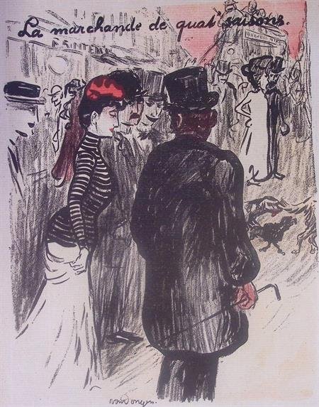 De kunststijl van de Belle Époque, circa 1871-1914, weerspiegelde het vertrouwen in vooruitgang en de schoonheid van het dagelijks leven. Kunstenaars als Mucha en Toulouse-Lautrec maakten gebruik van organische lijnen en decoratieve elementen. Deze stijl beïnvloedde niet alleen schilderkunst, maar ook interieurontwerp en mode.Vertaald uit het Frans 'A son printemps, à l'âge de vingt ans, elle en avait beaucoup'. Op de prent is een ondertitel te lezen: In haar lente, op twintigjarige leeftijd, had ze veel.Van Dongen’s karikatuurprenten zijn satirische weergaven van mensen uit zijn tijd, vaak beroemdheden uit de Parijse kunst- en uitgaanswereld. Met vloeiende lijnen en opvallende kleuren gaf hij zijn figuren een bijna groteske uitstraling, waardoor elk portret een eigen verhaal vertelt.Deze prent is uitgegeven in L’Assiette au Beurre. Het satirische werk in L’Assiette au Beurre was bekend om zijn expressieve en soms provocerende tekeningen. Door satire werden gevoelige onderwerpen zoals militaire macht en uitbuiting besproken, waarmee de illustratoren de lezer aan het denken wilden zetten over de gevestigde orde.De afmeting van deze prent is ca. 25 bij 32 centimeter.#spotprent #propaganda #krant #kunst #cadeau #stoer #Belle Epoque #Lente #Vrouw #Man