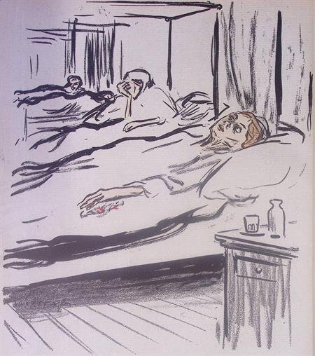 In de Belle Époque werd het leven gevierd met een weelderige en elegante stijl in de kunst. Kunstenaars gebruikten zachte kleuren, vloeiende lijnen en florale motieven. De periode kenmerkt zich door vernieuwende ontwerpen in affiches, sieraden en gebouwen, waarbij creativiteit en luxe centraal stonden.Vertaald uit het Frans 'Troisième fantôme (La Malade)'. De ondertitel leest: Derde Geest (De Zieke Vrouw).De karikaturen van Kees van Dongen kenmerken zich door hun scherpe observaties en gedurfde overdrijvingen. Hij vatte de persoonlijkheid van zijn modellen in sterke contrasten en felle tinten, waardoor iedere prent een levendig en soms spottend beeld van de geportretteerden laat zien.Deze prent is uitgegeven in L’Assiette au Beurre. In L’Assiette au Beurre werden maatschappelijke en politieke thema's satirisch behandeld. Met spotprenten vol ironie werd kritiek geleverd op thema’s zoals de regering, de kerk en het kapitalisme. Het blad gebruikte satire als krachtig wapen om hypocrisie en sociale onrechtvaardigheid aan de orde te stellen.De afmeting van deze prent is ca. 25 bij 32 centimeter.#spotprent #propaganda #krant #kunst #cadeau #stoer #Belle Epoque #Geest #Vrouw #Ziek