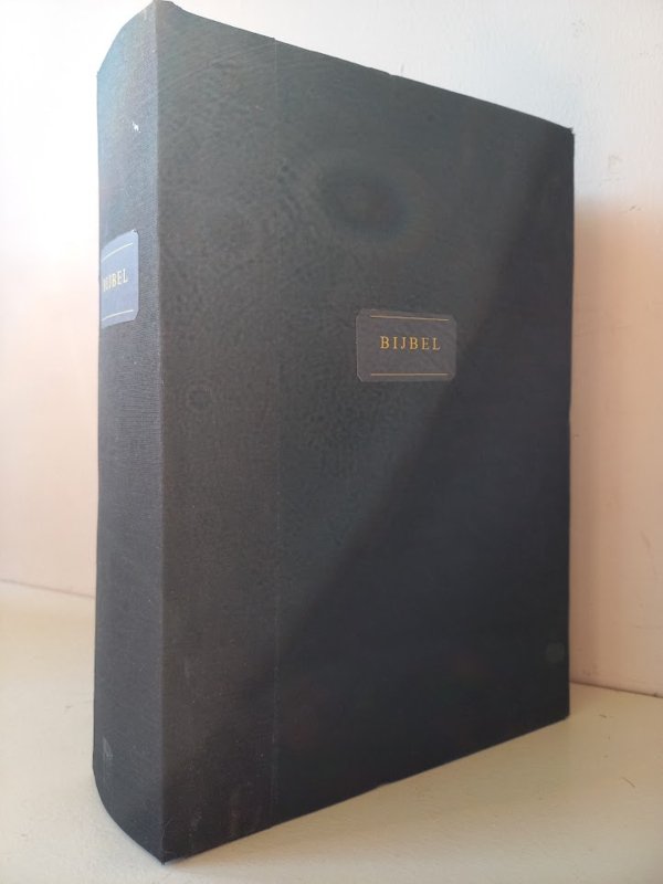 Minor-huisbijbel, 17 x 24 x 5,5 cm, zwart linnen platten. Toegevoegd: - Eenige Bijbelplaatsen voor bijzondere gelegenheden en tijden - Concordantie van den Bijbel - Platen (zie foto 3) (geen platen van de Heere Jezus) |