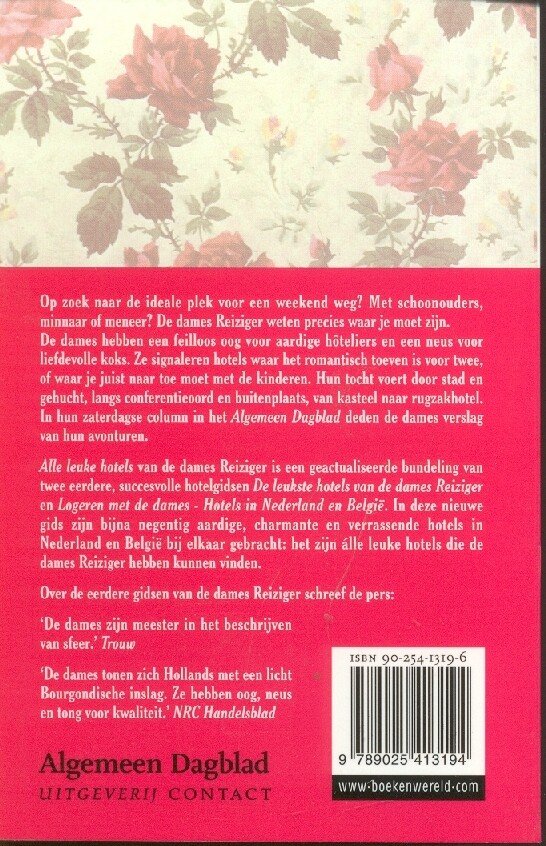 De dames hebben een feilloos oog voor aardige hôteliers en een neus voor liefdevolle koks. Ze signaleren hotels waar het romantisch toeven is voor twee, of waar je juist naar toe moet met de kinderen. Hun tocht voert door stad en gehucht, langs conferentieoord en buitenplaats, van kasteel naar rugzakhotel. In hun zaterdagse column in het Algemeen Dagblad deden de dames verslag van hun avonturen. Alle leuke hotels van de dames Reiziger is een geactualiseerde bundeling van twee eerdere, succesvolle hotelgidsen De leukste hotels van de dames Reiziger en Logeren met de dames - Hotels in Nederland en België. In deze nieuwe gids zijn maar liefst negentig aardige, charmante en verrassende hotels in Nederland én België bij elkaar gebracht: het zijn álle leuke hotels die de dames Reiziger hebben kunnen vinden. |