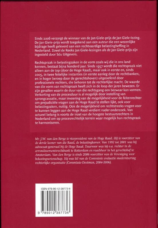 De jury - prof.dr.mr. R.E.C.M. Niessen, advocaat-generaal bij de Hoge Raad en hoogleraar Formeel belastingrecht aan de Radboud Universiteit Nijmegen - prof.dr. F. Sonneveldt, partner-aandeelhouder bij Mazars Paardekooper Hoffman, sectie estate planning. Hij is hoogleraar Successiewet en Estate Planning aan de Universiteit Leiden, Lecturer International Tax Program aan de Universiteit Leiden, Hoofddocent Grotius Opleiding Estate Planning. Tevens raadsheer-plaatsvervanger Hof Den Bosch - prof.dr. A.O. Lubbers, hoogleraar Belastingrecht aan de Universiteit Leiden - mr. C.M. Ettema, raadsheer in het Gerechtshof Arnhem Veranderingen in de belastingrechtspraak Rechtspraak in belastingzaken in de vorm zoals wij die in ons land kennen, bestaat bijna honderd jaar. Sinds 1957 wordt die rechtspraak niet alleen aan de top (door de Hoge Raad), maar ook in eerste en, sinds 2005, in twee feitelijke instanties uitgeoefend door professionele rechters. Die behoren tot de rechterlijke macht. De waarde van die vorm van rechtspraak heeft zich in de loop der jaren bewezen. Er zijn gevallen waarin de duur van die rechtsgang een bezwaar kan vormen. Verkorting van de procesduur is al mogelijk door instelling van sprongcassatie, maar invoering van de mogelijkheid voor de feitenrechter om prejudiciële vragen aan de Hoge Raad te stellen lijkt, ook voor belastingzaken, nuttig. Ook de mogelijkheid om rechtstreeks vragen voor te kunnen leggen aan de Hoge Raad verdient nader onderzoek. Van actueel belang is voorts de inzet van de hoogste bestuursrechters in Nederland om op procesrechtelijk terrein waar mogelijk hun rechtspraak te harmoniseren. Over de auteur Mr. J.W. van den Berge is vicepresident van de Hoge Raad. Hij is voorzitter van de derde kamer van die Raad, de belastingkamer. Van 1992 tot 2001 was hij advocaat-generaal bij de Hoge Raad. Daarvoor was hij o.a. rechter in de arrondissementsrechtbank te Rotterdam en raadsheer in het gerechtshof te Amsterdam. Van den Berge is sinds 2006 voorzitter van de Vereniging voor belastingwetenschap. Hij was lid van de Commissie evaluatie modernisering rechterlijke organisatie (Commissie-Deetman, 2004-2006). |