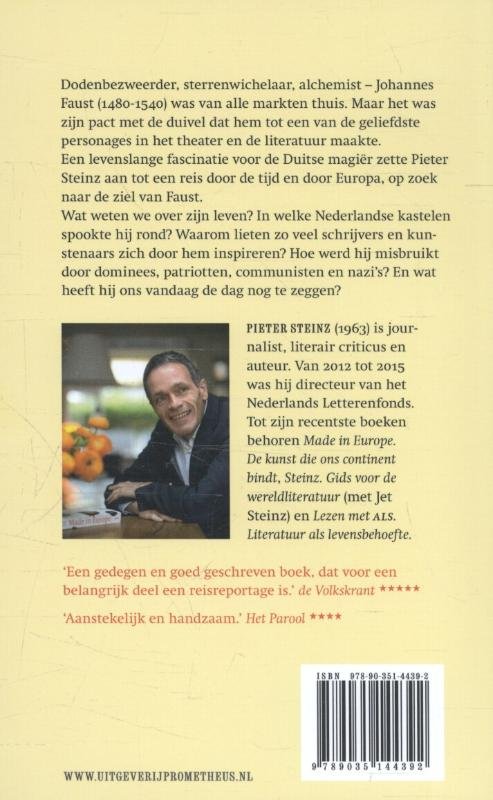 Dodenbezweerder, sterrenwichelaar, alchemist - Johannes Faust (1480-1540) was van alle markten thuis. Maar het was zijn pact met de duivel dat hem tot een van de geliefdste personages in het theater en de literatuur maakte.Een levenslange fascinatie voor de Duitse magiër zette Pieter Steinz aan tot een reis door de tijd en door Europa, op zoek naar de ziel van Faust.Wat weten we over zijn leven? In welke Nederlandse kastelen spookte hij rond? Waarom lieten zo veel schrijvers en kunstenaars zich door hem inspireren? Hoe werd hij misbruikt door dominees, patriotten, communisten en nazi's? En wat heeft hij ons vandaag de dag nog te zeggen?Pieter Steinz (1963) is journalist, literair criticus en auteur. Van 2012 tot 2015 was hij directeur van het Nederlands Letterenfonds. Tot zijn recentste boeken behoren Made in Europe. De kunst die ons continent bindt, Steinz. Gids voor de wereldliteratuur (met Jet Steinz) en Lezen met ALS. Literatuur als levensbehoefte.'Een gedegen en goed geschreven boek, dat voor een belangrijk deel reisreportage is.' de Volkskrant *****'Aanstekelijk en handzaam.' Het Parool ****