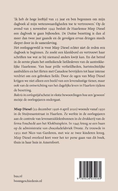 ‘Ik heb de hoge leeftijd van 15 jaar en ben begonnen om mijn dagboek al mijn wetenswaardigheden toe te vertrouwen.’ Op de avond van 5 november 1942 besluit de Haarlemse Miep Diesel een dagboek te gaan bijhouden. De Duitse bezetting is dan al meer dan twee jaar gaande en de gevolgen ervan dringen steeds dieper door in de samenleving. Het oorlogsgeweld is voor Miep Diesel echter niet de reden een dagboek te beginnen. Ze zoekt een klankbord en vertrouwt haar schriften toe wat ze bij niemand anders kwijt kan. En dat betrof in de eerste plaats het ontluikende liefdesleven van de aantrekkelijke Haarlemse. Van haar prille verliefdheden, hartstochtelijke aanbidders en het flirten met Canadese bevrijders tot haar intense verdriet om een gebroken liefde. Door de ogen van Miep Diesel krijgen we niet alleen een beeld van een levenslustige tiener, maar ook van de ontwrichting van het dagelijks leven in Haarlem tijdens de bezetting. Bakvis in oorlogstijd schetst in vlotte bewoordingen hoe een ‘gewoon’ meisje de oorlogsjaren ondergaat.