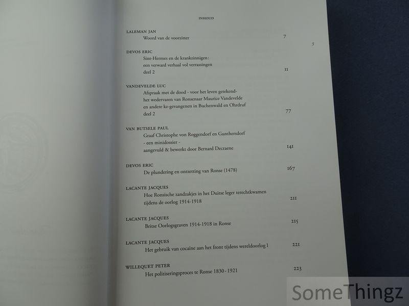 Verzameling van diverse wetenschappelijke artikels m.b.t. de geschiedenis van Ronse. Inhoud: 1. Sint-Hermes en de krankzinnigen: een verward verhaal vol verrassingen; 2. Afspraak met de dood - voor het leven getekend - het wedervaren van Ronsenaar Maurice Vandevelde en andere kz-gevangenen in Buchenwald en Ohrdruf, deel 2; 3. Graaf Christophe von Roggendorf en Gunthersdorf aangevuld en & bewerkt door Bernard Decraene; 4. De plundering en ontzetting van Ronse (1478); 5. Hoe Ronsische zandzakjes in het Duitse leger terechtkwamen tijdens de oorlog 1914-1918; 6. Britse oorlogsgraven 1914-1918 in Ronse; 7. Het gebruik van cocaïne aan het front tijdens wereldoorlog 1; 8. Het politiseringsproces te Ronse 1830-1921; 9.Met Sint-Hermes van Ronse naar de Unesco in Parijs; 10. Rijmen en gedichten op de doodsprentjes van de Broeders van Goede Werken te Ronse; 11. Liedjes in het interbellum; 12. Verwantschap Cypriaan de Rore en Pierre Van Wynen.