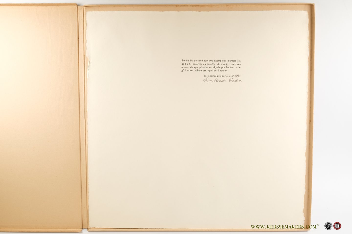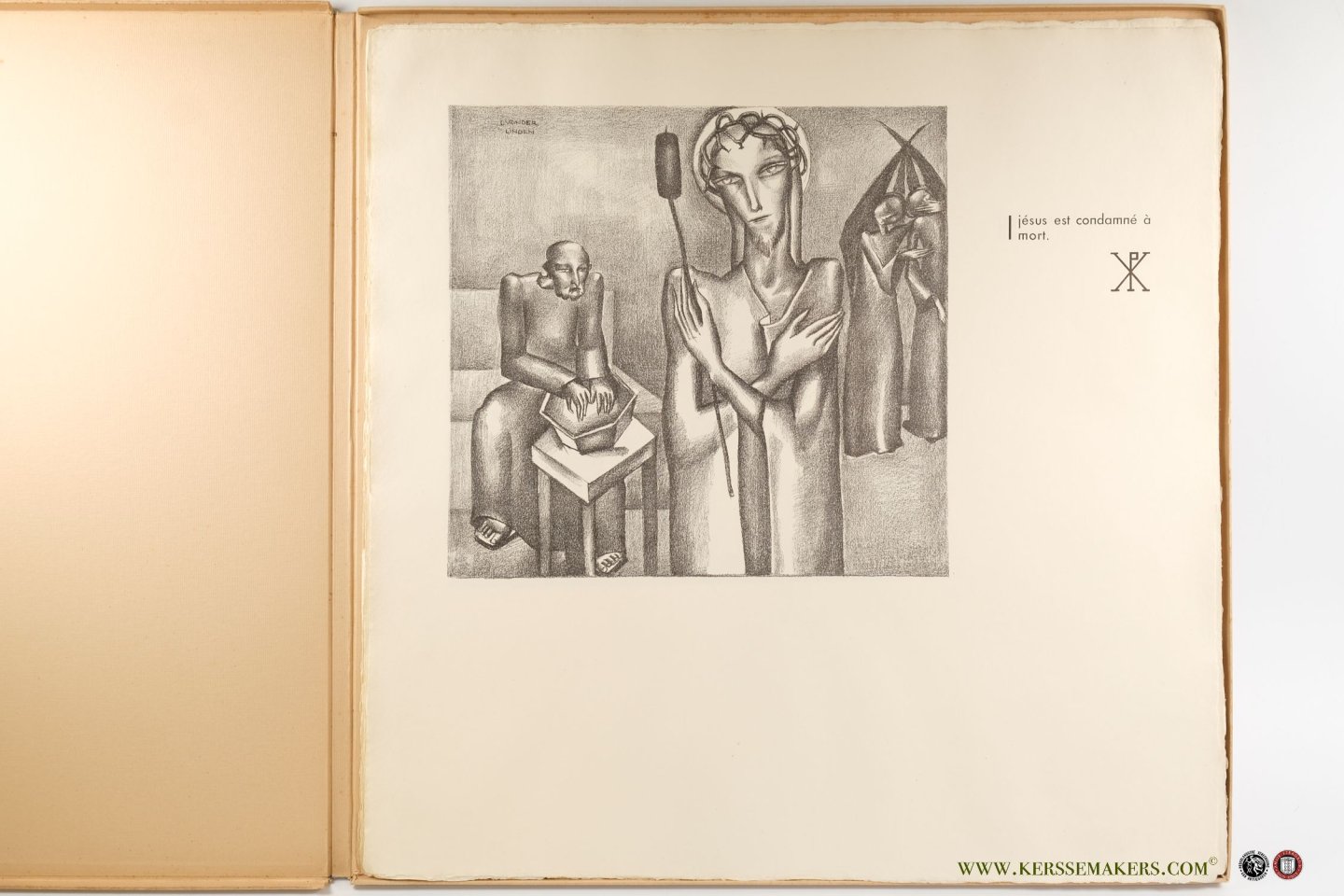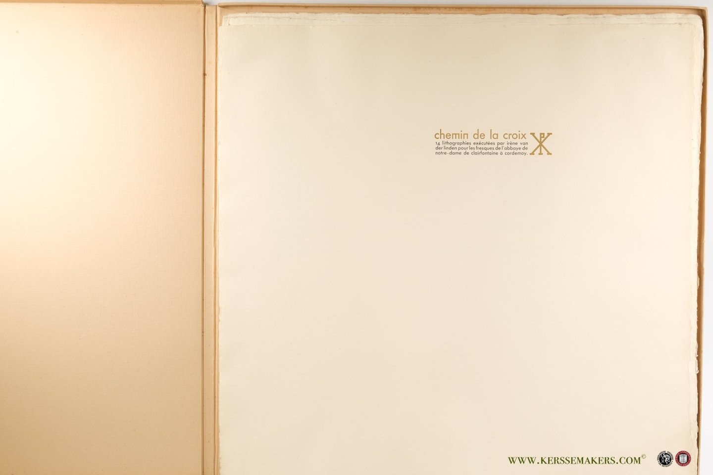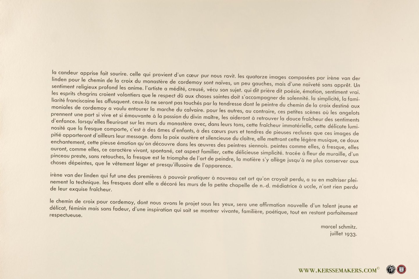 corners sl. dam.). 1) title, printed in gold and black, 2) Preface, 3) Colophon) and 14 leaves with lithogrphies of Irène van der Linden. In perfect condition. - The lithographies, 30 x 30 cm, dated 1930, are accompanied with the titles of the Stations of the Cross . Designs for fresco paintings made for the trappist nuns of Cordemois, near Bouillon. - Limited edition of the album in 210 numbered copies on stiff handmade paper. - Number 180, signed by the artist