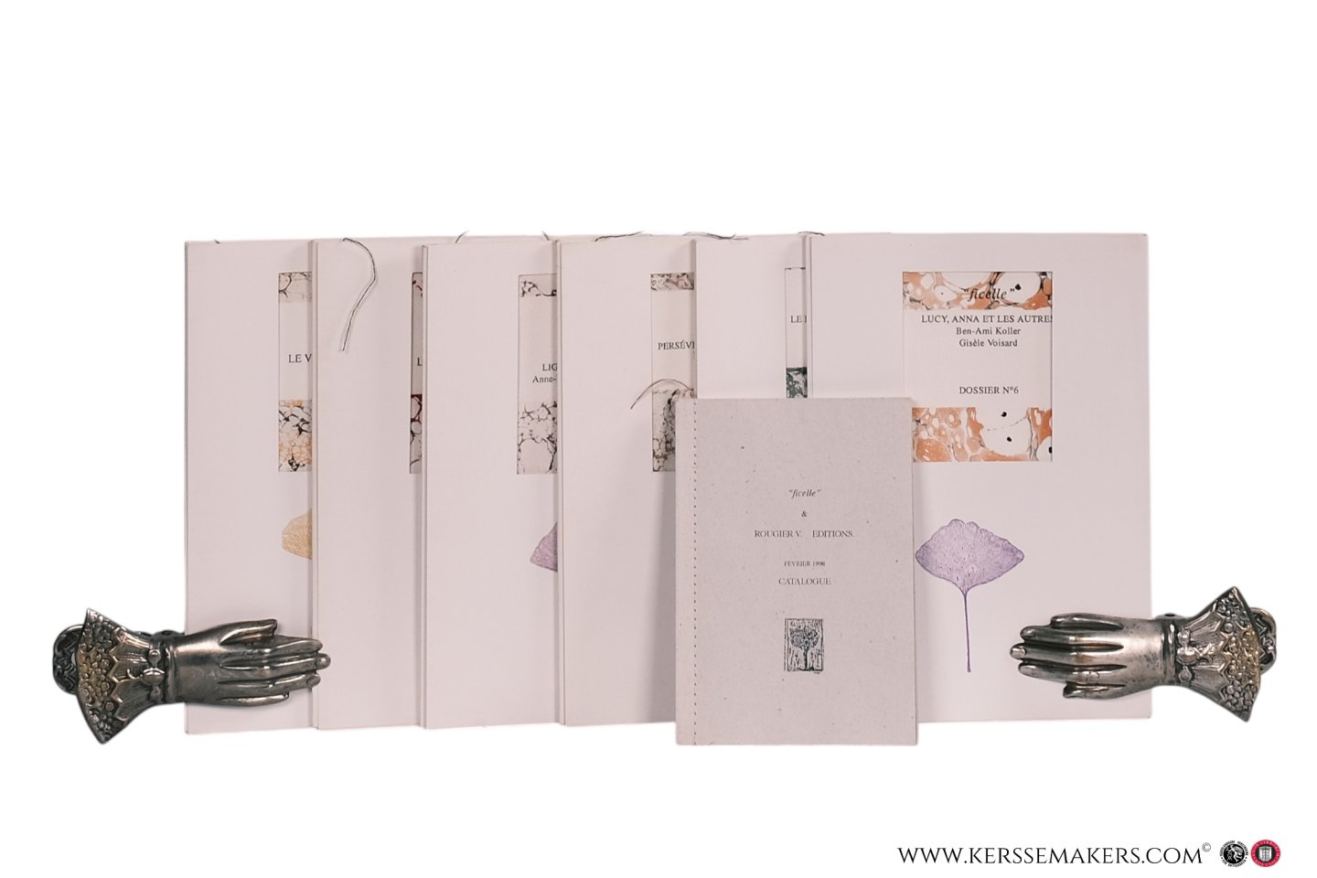 répographie pour le texte et marbré au baquet pour la couverture". - Dossier No 1. Rougier. Le vin. La préhistoire. 16 pp. With etching on yellow background. No 7/30. - No 2. Guiton. Le paysage. La préhistoire. 24 pp. Etching in colours. No 19/30. - No 3. Guerchet-Jeannin. Lignes de mémoire 24 pp. With etching. No 26/30. - No 4. Gourier. Persévérance de la pierre. 26 pp. With embossed etching. No 21/30. - No 5. Peytral. Envol. Le bond hors de la pierre. Sortir de Lascaux. With brown-toned etching. No 26/30. - No 6. Koller, Voisard e.a. With etching. No 28/30. - Limited editions to 30 numbered copies, printed on handmade paper "Rives". Marbled wrappers with protective slip cover. Wrappers stitched by sewing-machine 'en point droit'. - Nice perfect set. - Added: Catalogue, février, 1998 of "ficelle" & Vincent Rougier editions, situeted at 'Le Moulin Etendoir des Belles Rives. (15x10,5 cm), 24 pp. incl. wrappers, also stitched 'n point droit', printed on grey paper. - Together 7 items.