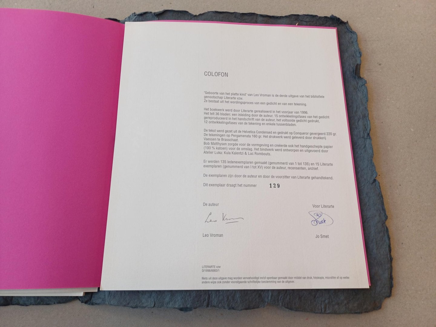 Bijzonderheden: 1996, Colophon gesigneerd door Leo Vroman en Jo Smet. Geschept papieren map met daarin de inleiding, de ontwikkeling van een gedicht in facsimile handschrift, ontwikkeling van een tekening van Vroman, voltooide gedicht, voltooide tekening en het c...
