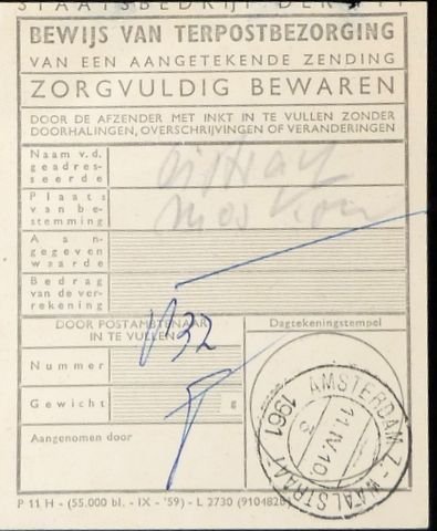 Oistrach, David: - Bewijs van terpostbezorging [aan David Oistr