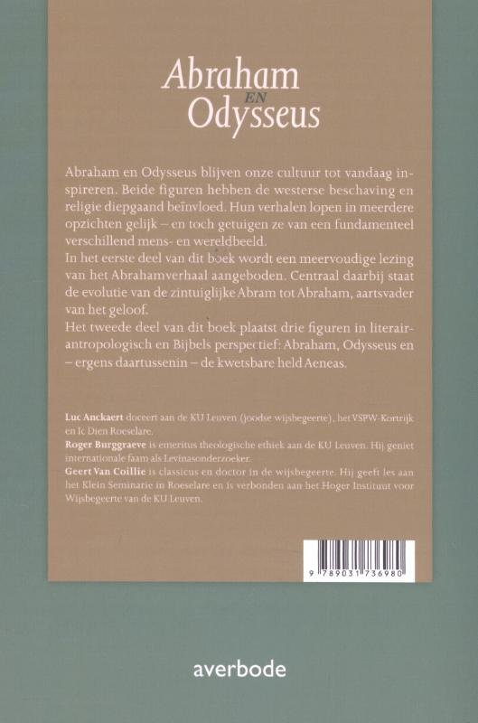 Abraham en Odysseus blijven onze cultuur tot vandaag inspireren. Beide figuren hebben de westerse beschaving en religie diepgaand beïnvloed. Hun verhalen lopen in meerdere opzichten gelijk - en toch getuigen ze van een fundamenteel verschillend mens- en wereldbeeld. In het eerste deel van dit boek wordt een meervoudige lezing van het Abrahamverhaal aangeboden. Centraal daarbij staat de evolutie van de zintuiglijke Abram tot Abraham, aartsvader van het geloof.Het tweede deel van dit boek plaatst drie figuren in literair-antropologisch en Bijbels perspectief: Abraham, Odysseus en - ergens daartussenin - de kwetsbare held Aeneas.