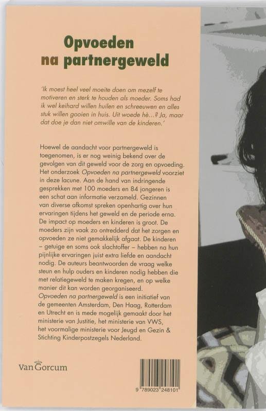? Ja, maar dat doe je dan niet omwille van de kinderen.Hoewel de aandacht voor partnergeweld is toegenomen, is er nog weinig bekend over de gevolgen van dit geweld voor de zorg en opvoeding.Het onderzoek Opvoeden na partnergeweld voorziet in deze lacune. Aan de hand van indringende gesprekken met 100 moeders en 84 jongeren is een schat aan informatie verzameld. Gezinnen van diverse afkomst spreken openhartig over hun ervaringen tijdens het geweld en de periode erna.De impact op moeders en kinderen is groot. De moeders zijn vaak zo ontredderd dat het zorgen en opvoeden ze niet gemakkelijk afgaat. De kinderen getuige en soms ook slachtoffer hebben na hun pijnlijke ervaringen juist extra liefde en aandacht nodig. De auteurs beantwoorden de vraag welke steun en hulp ouders en kinderen nodig hebben die met relatiegeweld te maken kregen, en op welke manier dit kan worden georganiseerd.Opvoeden na partnergeweld is een initiatief van de gemeenten Amsterdam, Den Haag, Rotterdam en Utrecht en is mede mogelijk gemaakt door het ministerie van Justitie, het ministerie van VWS, het voormalige ministerie voor Jeugd en Gezin & Stichting Kinderpostzegels Nederland.
