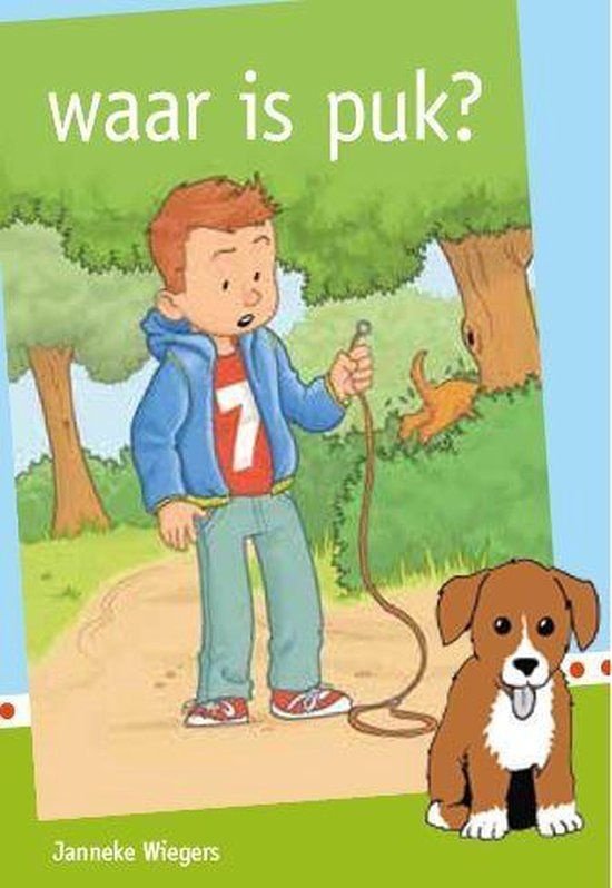 Waar is Puk? van Janneke Wiegers, een eenvoudig verhaaltje voor kinderen die net een paar weken leesonderwijs hebben gehad; zonder tweeklanken of dubbele medeklinkers.