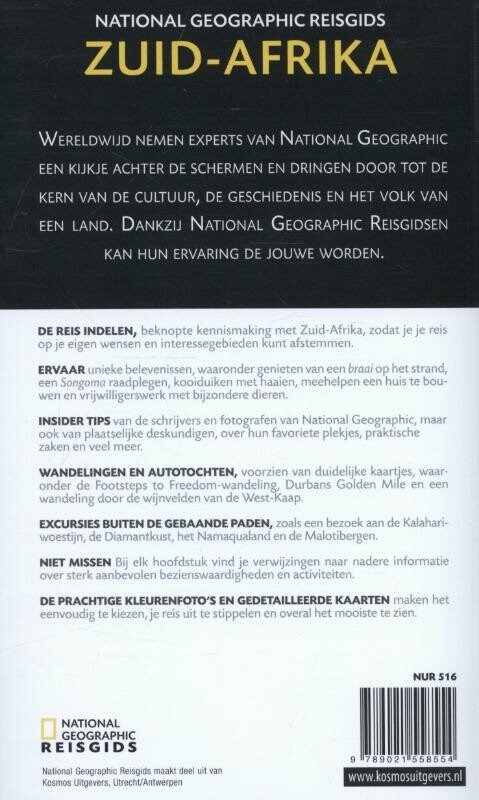 National Geographic Reisgids Zuid-Afrika is een exclusieve gids met sublieme fotografie die u meeneemt naar de bekende en minder bekende bezienswaardigheden. De experts van National Geographic nemen een kijkje achter de schermen en dringen door tot de kern van de cultuur, de geschiedenis en het volk van het land. Bezoek met deze National Geographic Reisgids Zuid-Afrika de Kalahariwoestijn, de Diamantkust, het Namaqualand en de Malotibergen. Geniet van een braai op het strand, raadpleeg een Songoma of maak een kooiduik met haaien. Of ervaar de Freedom-wandeling, Durbans Golden Mile en een wandeling door de wijnvelden van de West-kaap. De uitgebreide kennismaking met Zuid-Afrika, het overzicht met belevenissen die je niet mag missen, de insider tips, de excursies buiten de gebaande paden en de reiswijzer met hotels en restaurants en de handige kaarten maken de gids compleet. Speciaal aanbevolen voor natuur- en cultuurliefhebbers!