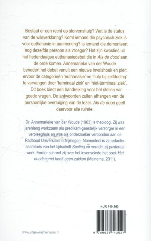Bestaat er een recht op stervenshulp? Wat is de status van de wilsverklaring? Komt iemand die psychisch ziek is voor euthanasie in aanmerking? Is iemand die dementeert nog dezelfde persoon als vroeger? Het zijn kwesties uit het hedendaagse euthanasiedebat die in 'Als de dood' aan de orde komen. Annemarieke van der Woude benadert het debat vanuit een nieuwe invalshoek en pleit ervoor de categorieën 'euthanasie' en 'hulp bij zelfdoding' te vervangen door 'terminaal ziek' en 'niet-terminaal ziek'.Dit boek biedt een handreiking voor het stellen van goede vragen. De antwoorden zullen afhangen van de persoonlijke overtuiging van de lezer. 'Als de dood' geeft daarvoor alle ruimte.Dr. Annemarieke van der Woude (1963) is theoloog. Zij was jarenlang werkzaam als predikant-geestelijk verzorger in een verpleeghuis en was als onderzoeker verbonden aan de Radboud Universiteit in Nijmegen. Momenteel is zij redactie-secretaris van het tijdschrift 'Speling' en verricht zij pastoraal werk. Eerder schreef zij over het levenseinde het boek 'Het doodshemd heeft geen zakken' (Meinema, 2011).