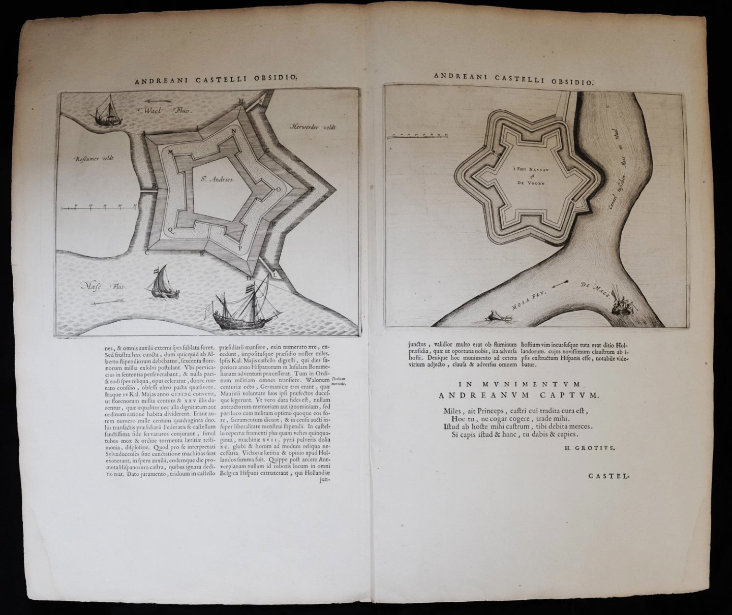 | Meer info: | Double copper engravings published in 1649 by Joan Blaeu, originating from Novum Ac Magnum Theatrum Urbium Belgicae Liberae Ac Foederatae.Size engraving Andreani Castelli Obsidio: ca. 21,5 cm x 26 cmSize engraving Castellum Vornamum: ca. 21,5 cm x 27,5 cm. No of Bindings |