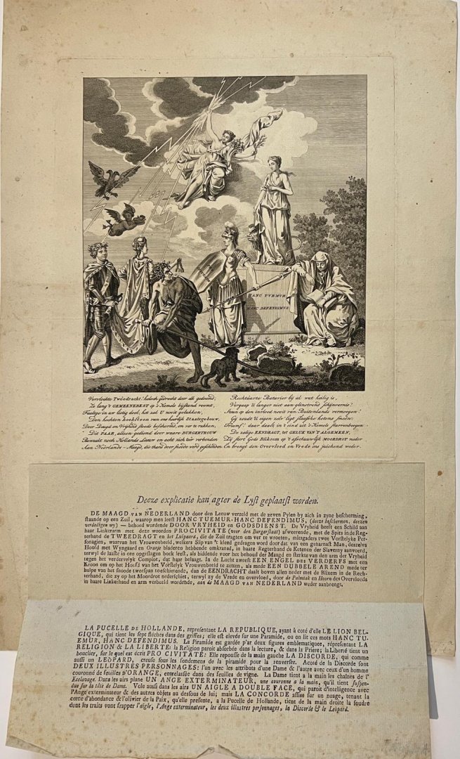 | Bijzonderheden: | Patriotic allegory on the attempts of Stadtholder William V (1748-1806) to restore his power, 1787. The Dutch Virgin and Lion standing on the cornerstone of the State Building that Tweedracht tries in vain to overthrow. Freedom protects the state ... |
