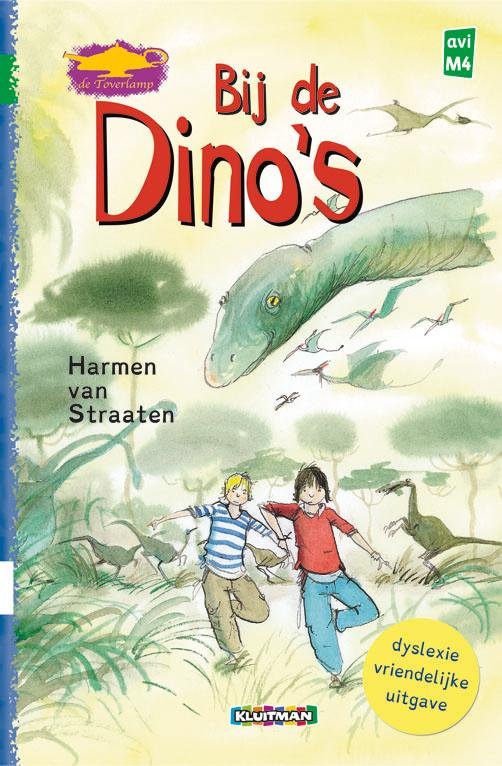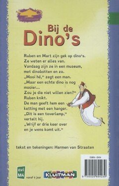 Spannend kinderboek voor beginnende lezers. AVI M4 (oud AVI 4)De kinderboeken van Harmen van Straaten zijn fantasierijk en spannend. Mart en Ruben zijn gek op dino's. Op vakantie krijgt Ruben een kettinkje met een toverlamp. Die vervult al je wensen, volgens de man die het geeft. En ja, als Ruben en Mart de volgende ochtend uit hun tent kruipen, zijn ze in het land van de dino's. Maar die zijn best gevaarlijk, vooral de T-rex. Ruben en Mart zijn gek op dino's.Ze weten er alles van.Vandaag zijn ze in een museum, met dinobotten en zo.'Mooi hè,' zegt een man.'Maar een echte dino is nog mooier...Zou je die niet willen zien?' Hij geeft Ruben een ketting met een hanger.'Dit is een toverlamp,' vertelt hij.'Wrijf er drie keer over en je wens komt uit...'Harmen van Straaten schreef het Kinderboekenweekgeschenk 2013!