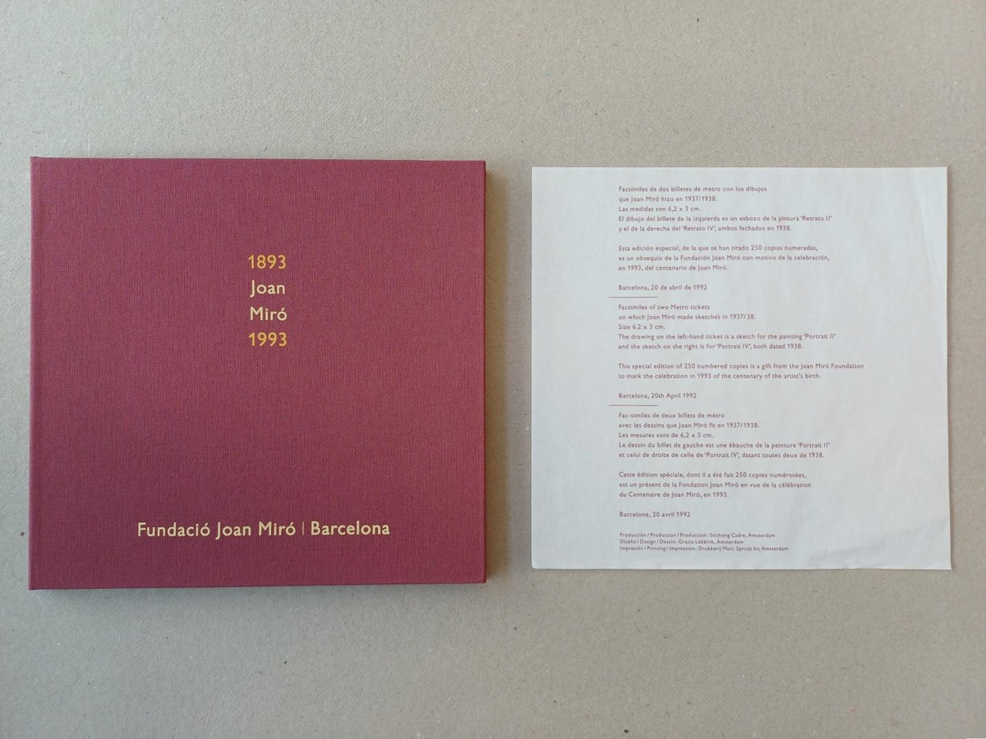 | Bijzonderheden: | Contains facsimiles of two metro tickets on which Joan Miro made sketches in 1937/38. Size of the tickets is 6.2 x 3 cm. The drawing of the left hand ticket is a sketch for the painting 'Portrait II' and the sketch on the right is for 'Portrait IV... |