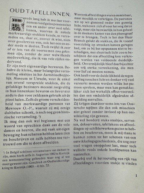 | Meer info: | Oud tafellinnen. Offprint/Extract 1908, 82pp. b/w illustrations, blank paper softcover binding, from the library of R. van Luttervelt and the collection of Prof. W. Fock. Authoritative text on old damast and tablecloths by the famous Jan Six. |